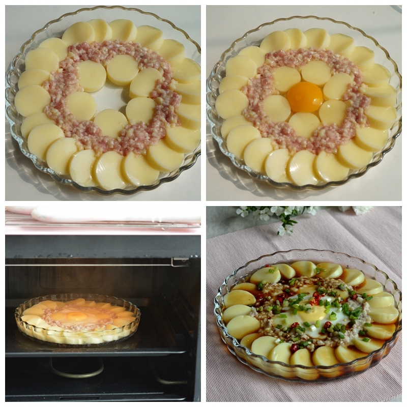 5. 将肉馅放在豆腐的空档处,将鸡蛋磕在中心处,看着还是很漂亮滴;