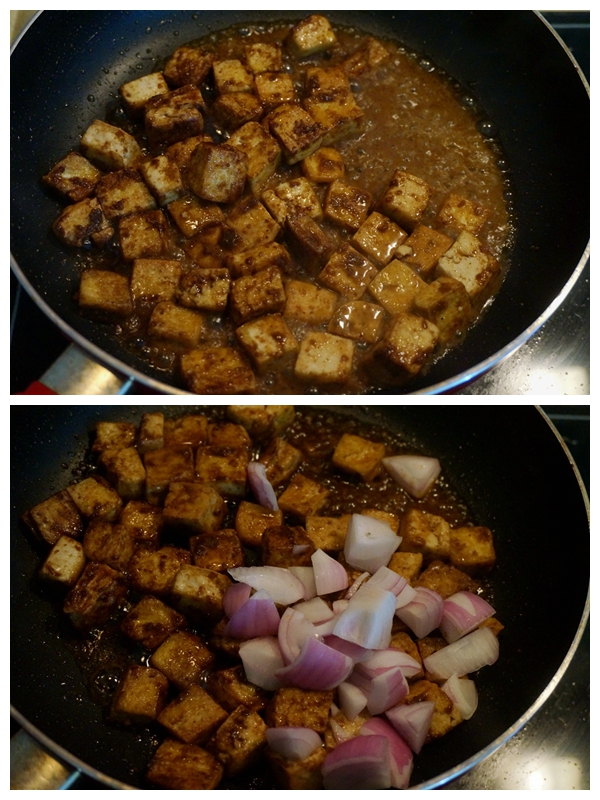6. 倒入半碗热水,让味道能渗入到豆腐中去;