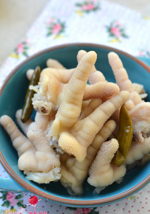 材料:鸡爪300克,八角一颗,香叶两片,姜一块,泡椒及泡椒水适量,花椒一撮,盐一勺,白糖1小勺,白醋2勺