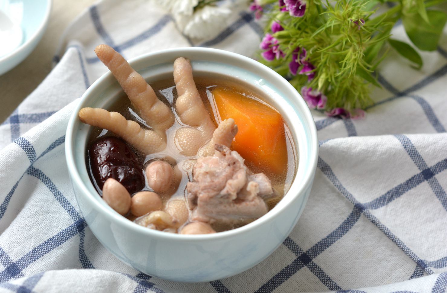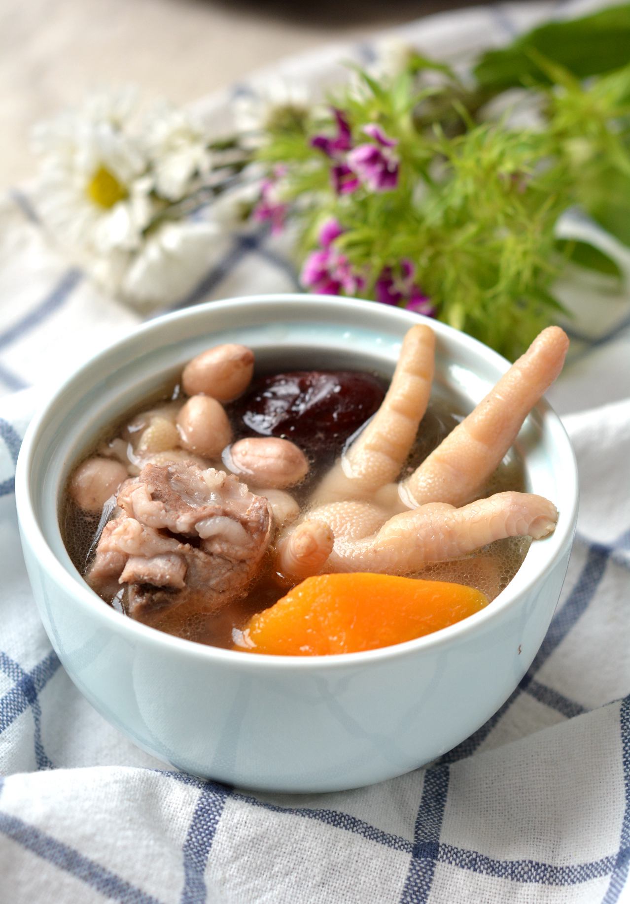 材料:排骨300克,鸡爪6个,木瓜半个,红枣3枚,花生一把,盐少许