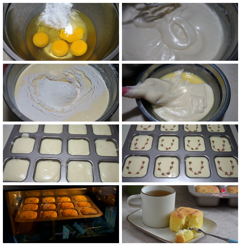 9. 可可蛋糕糊入裱花袋中,在每个蛋糕模具中滴几滴;