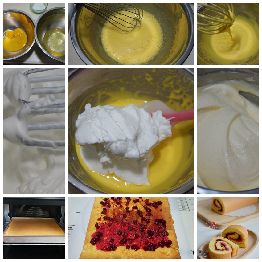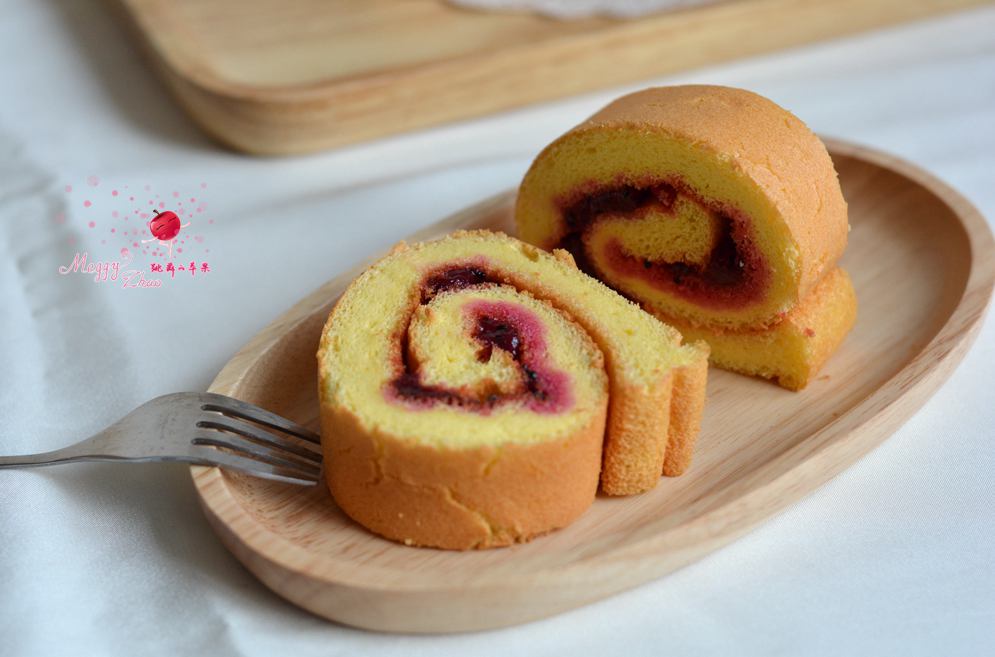 材料:低筋面粉50克,60克带壳鸡蛋4个,牛奶50克,亚麻籽油25克,白糖60克,火龙果果酱