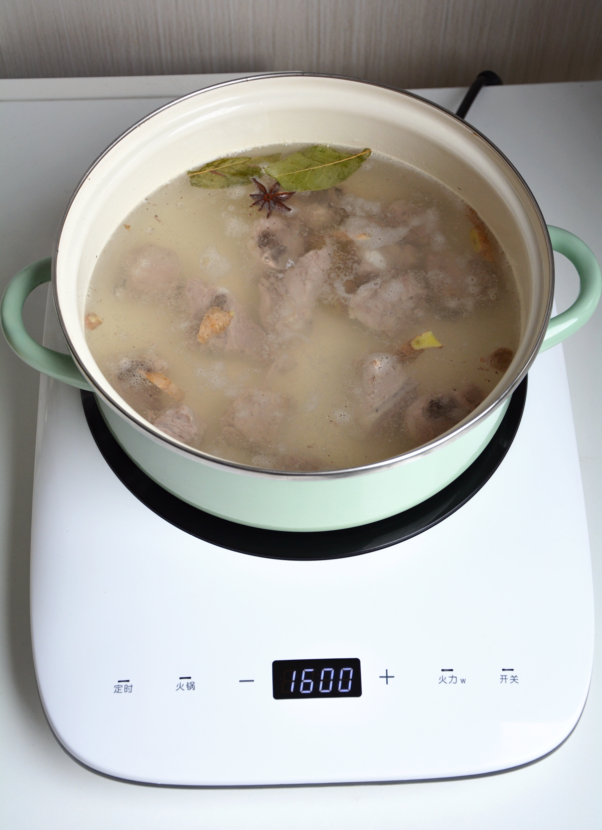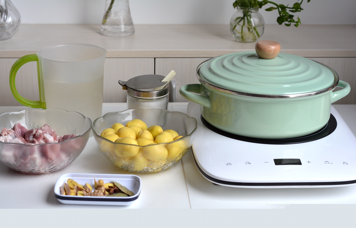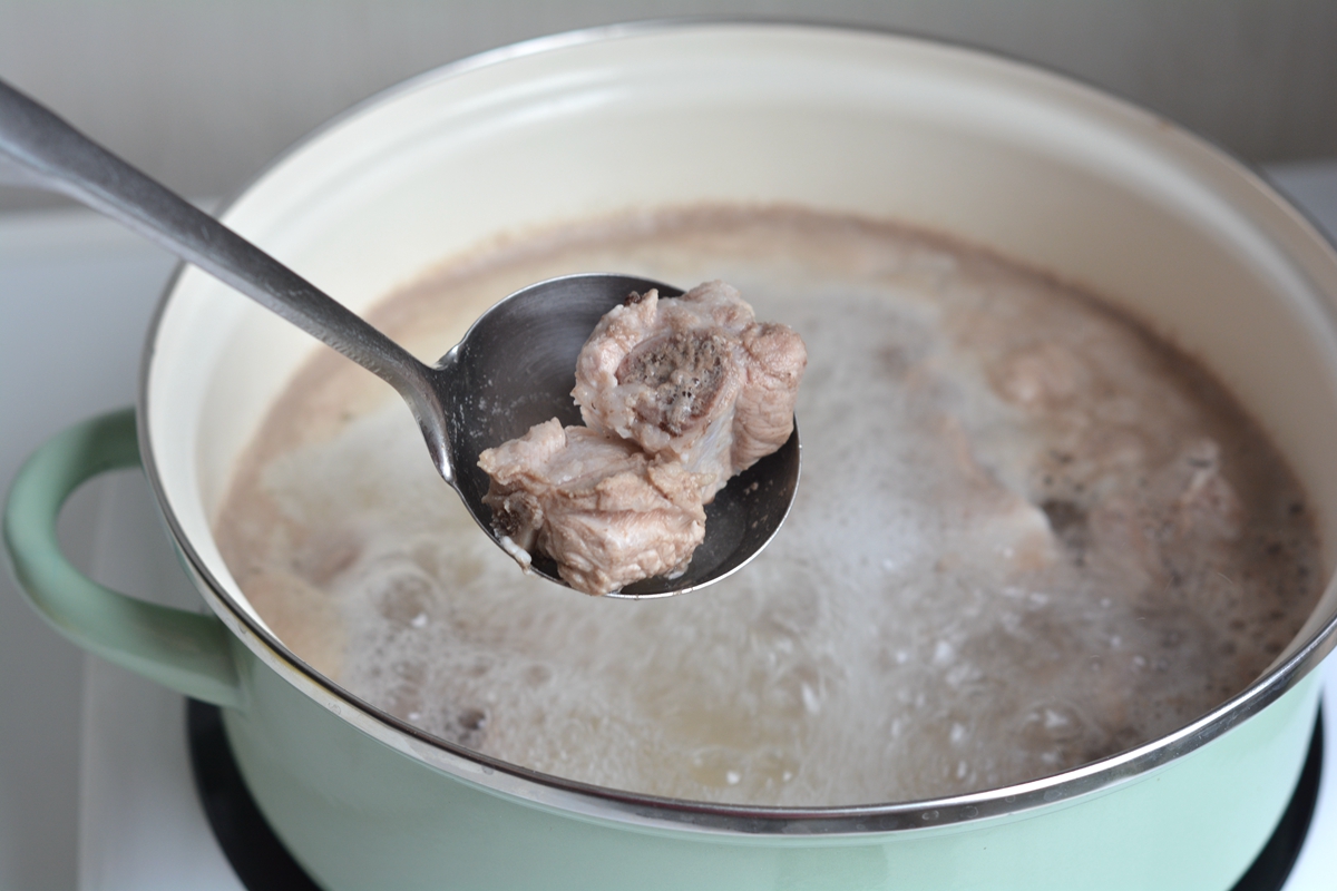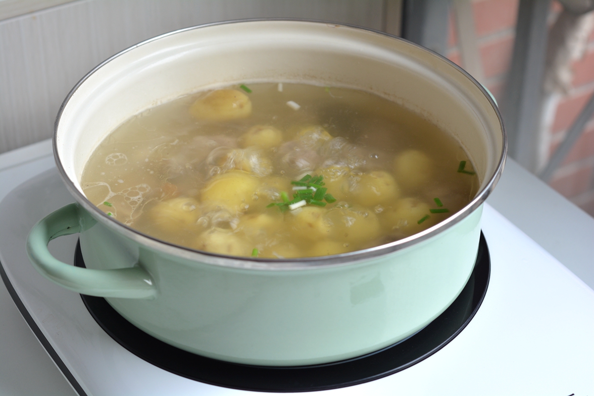 材料:排骨500克,小土豆1碗,姜1块,八角1颗,香叶2片,盐少许,香葱少许