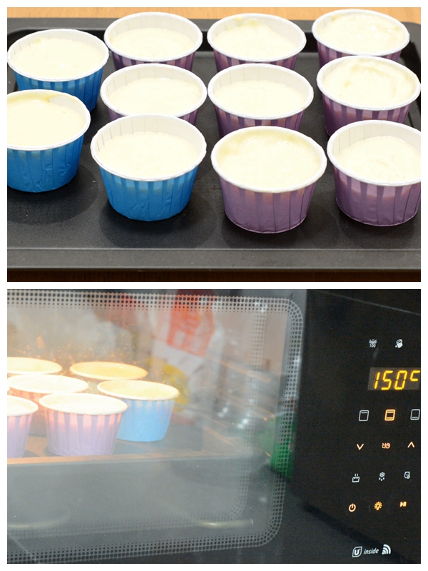 13. 用小勺将蛋糕糊舀入烘焙专用纸杯中,7、8分满都可以;7分满烤出来的蛋糕几乎与杯口平,8分满略鼓,显得更饱满;此时烤箱开始预热,175度上下火;