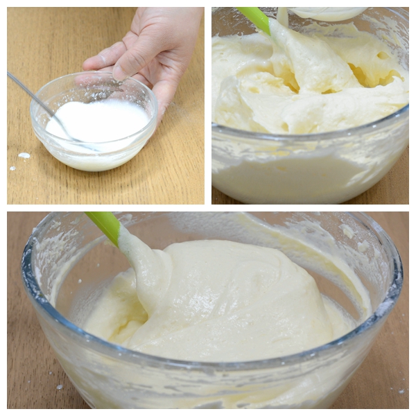 11. 将玉米牛奶融液顺着刮刀或者盆壁缓慢倒入蛋糊中;
