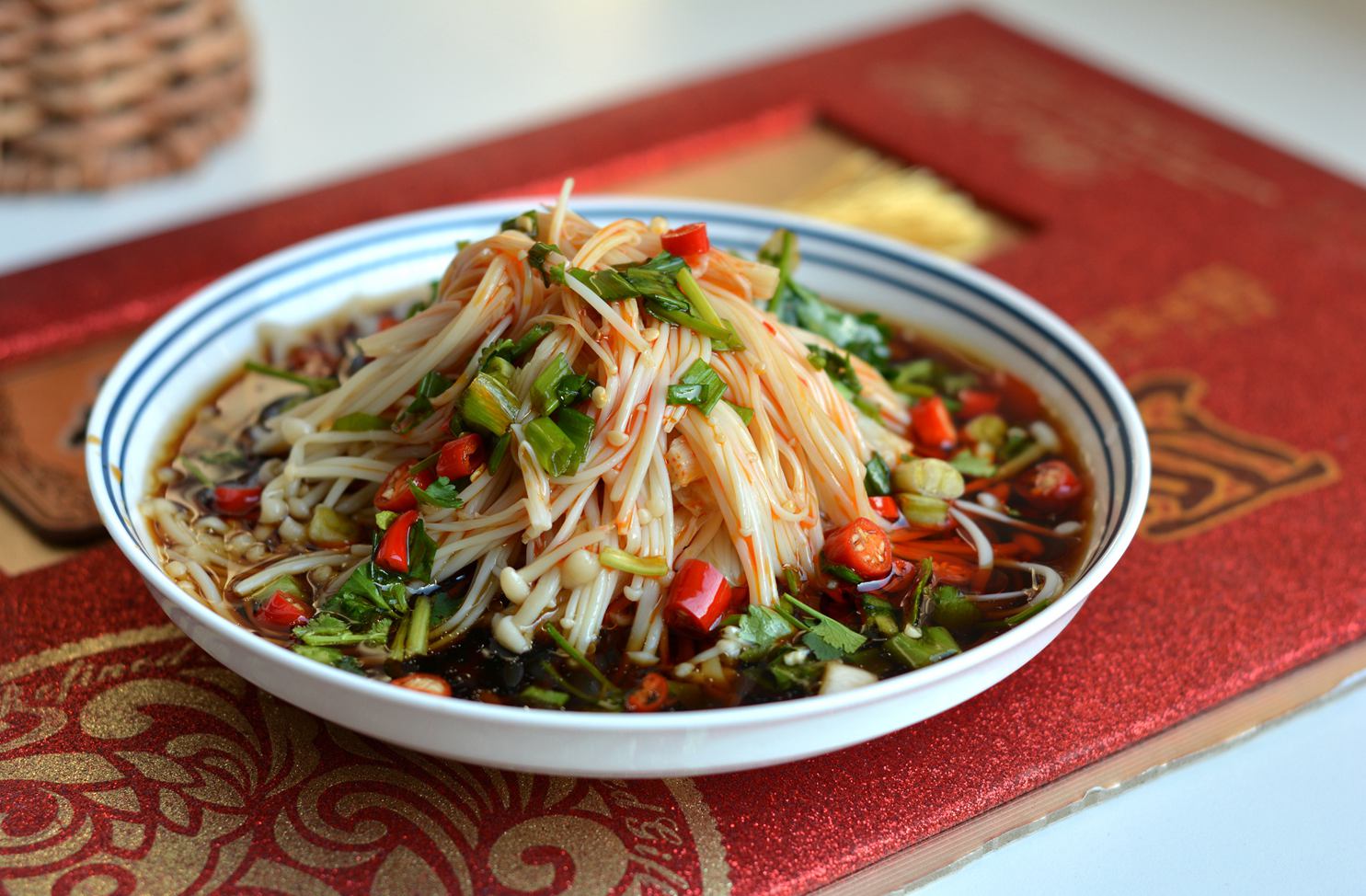 材料:金针菇1把,小米辣3个,香葱2棵,香菜1棵,生抽、米醋,香油少许,辣椒油