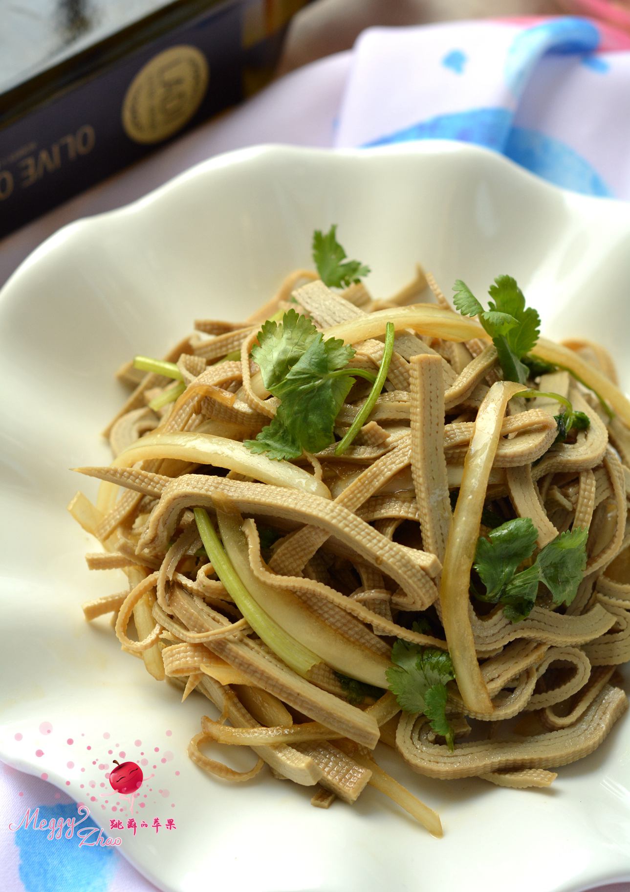 4. 倒入少许的橄榄油,将豆腐丝、香菜段入盆中,拌匀即可食用。