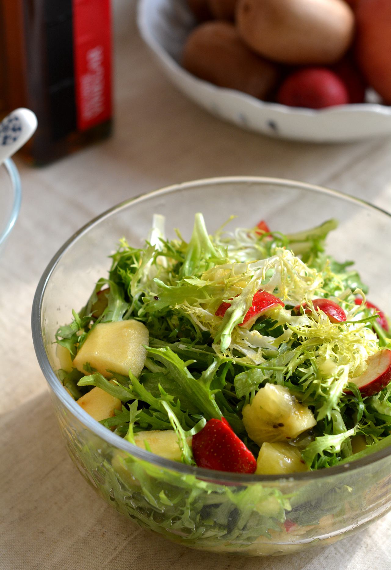 材料:苦苣一棵,苹果一个,猕猴桃两个,红葡萄酒醋,盐