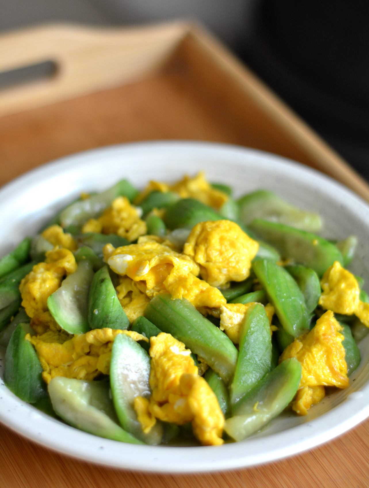 1. 丝瓜刮掉外皮,丝瓜切成滚刀块,鸡蛋磕入碗中,充分打散;