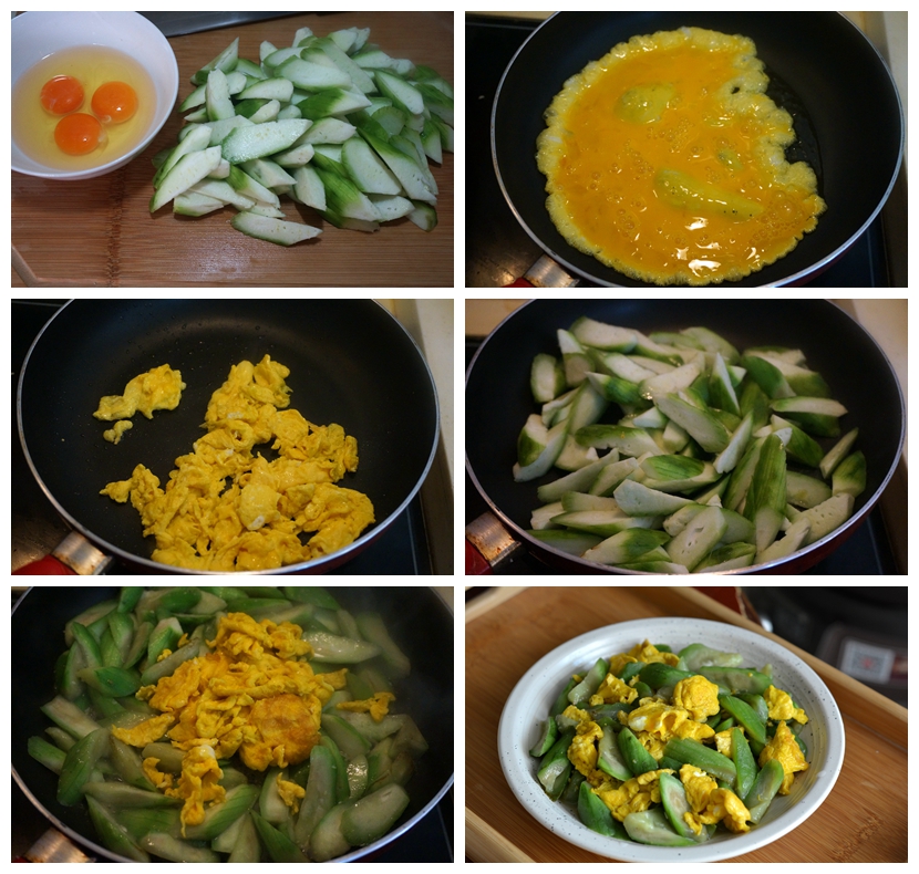 4. 撒盐,丝瓜变软,将鸡蛋块倒回锅中,混合均匀,出锅。