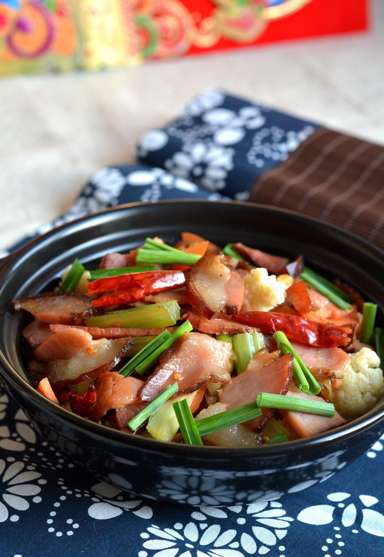4. 将腊肉倒入锅中翻炒;加入四颗干红辣椒,继续翻炒;