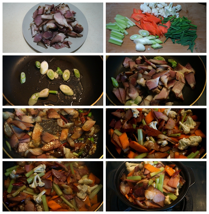 2. 菜花分小块,胡萝卜斜切成片,芹菜青蒜切寸段;
