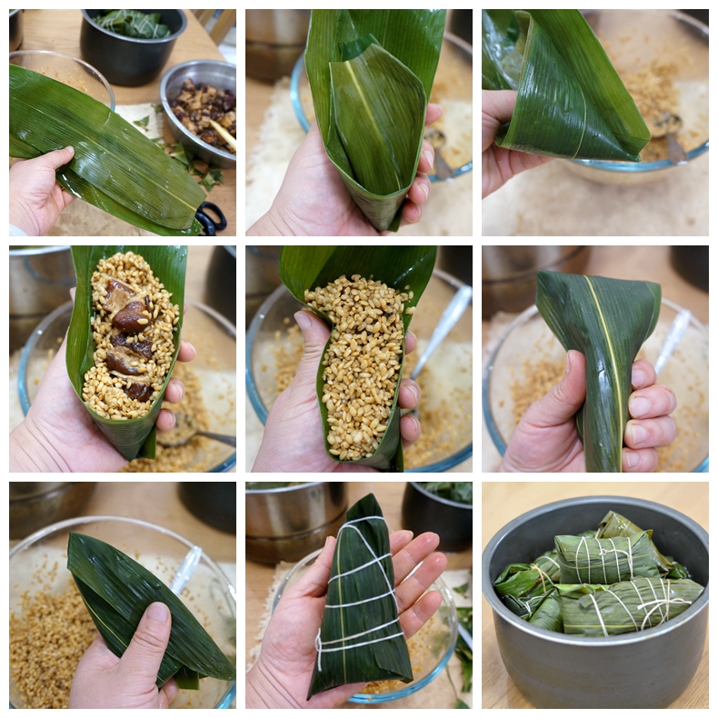 2. 粽子一开始折的时候要有个折边,上面的叶子盖住时也有两个折角,这样就不会让米粒漏出来了。