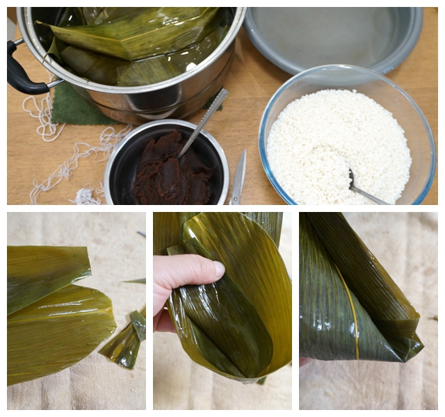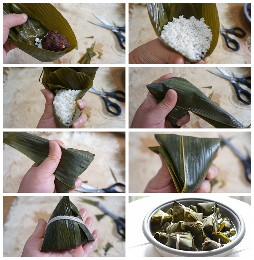 好啦,言归正传!今天的豆沙是买来现成的,省去炒馅的繁琐工序。用的时候拿勺舀一大勺,再盖上米,真不赖。只是我还不太满意的是,这豆沙放得有点少了,毕竟是第一次包,手法上面还拿不准,能包上不漏就是最满意的了!反正这粽叶买的有富余,以后存货吃完了,我再慢慢包几个,顺便也能将“技术”巩固一下。