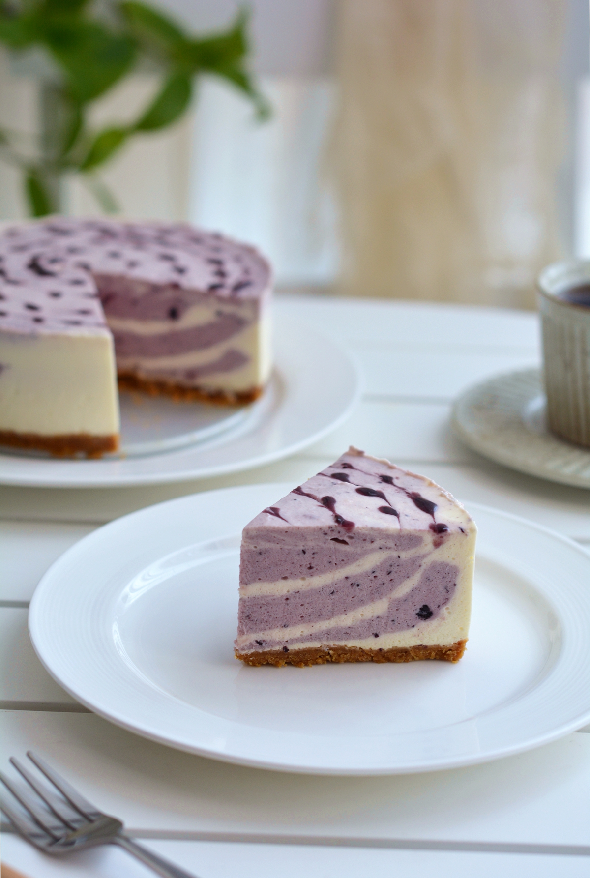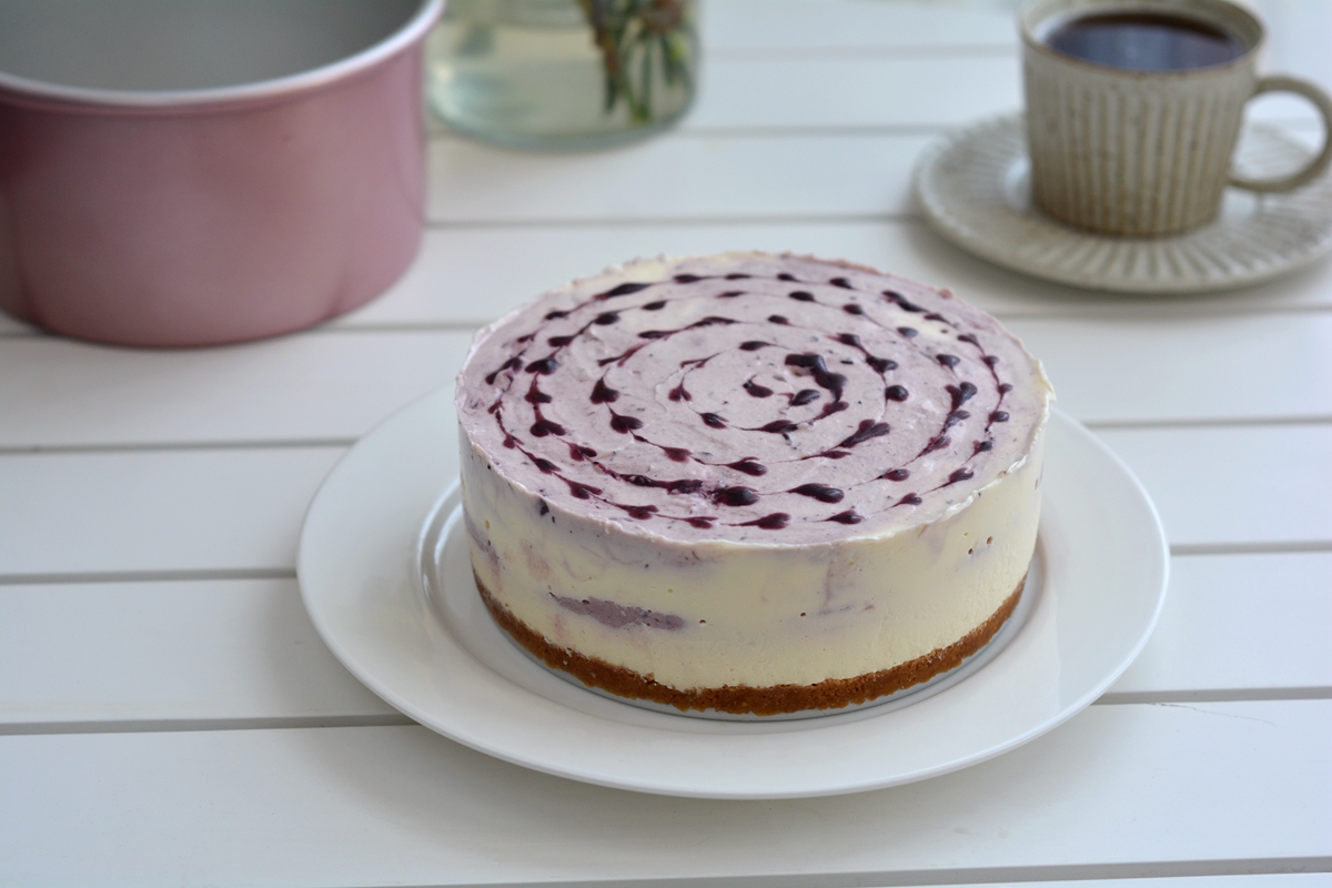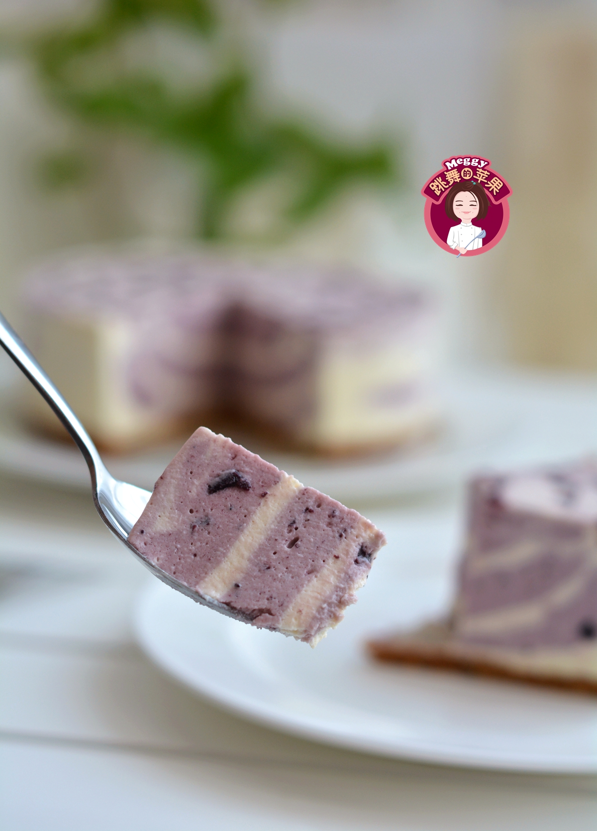 14. 原味奶油奶酪糊与蓝莓酱奶油奶酪糊交替着倒入蛋糕模具中,表面用刮刀抹平整即可。成品既可以这样,也可以在表面做个装饰如后一步,亦可做镜面;