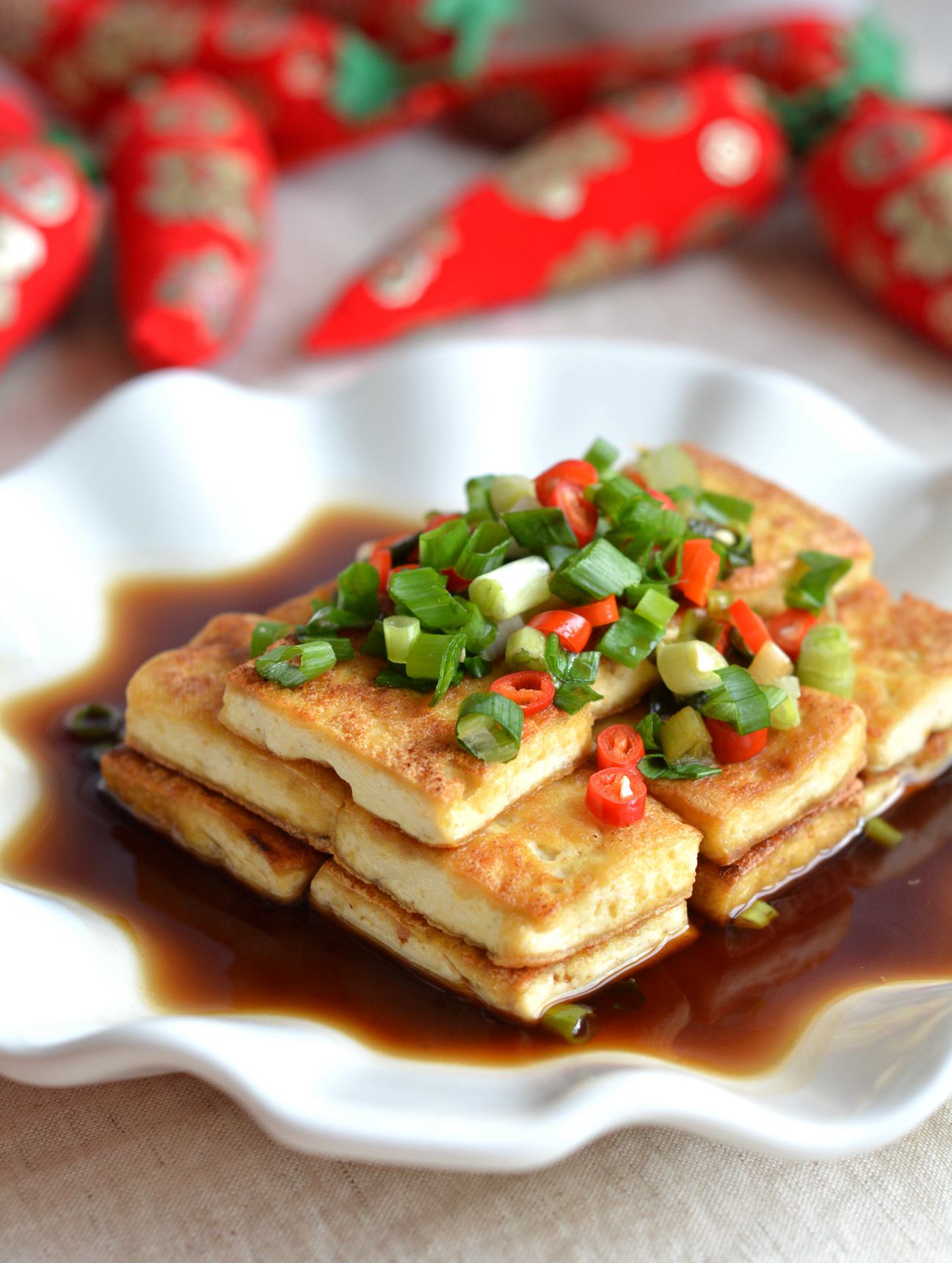 7. 将料汁浇在摆盘的脆皮豆腐上,再将剩下的香葱末和小米椒撒在上面。