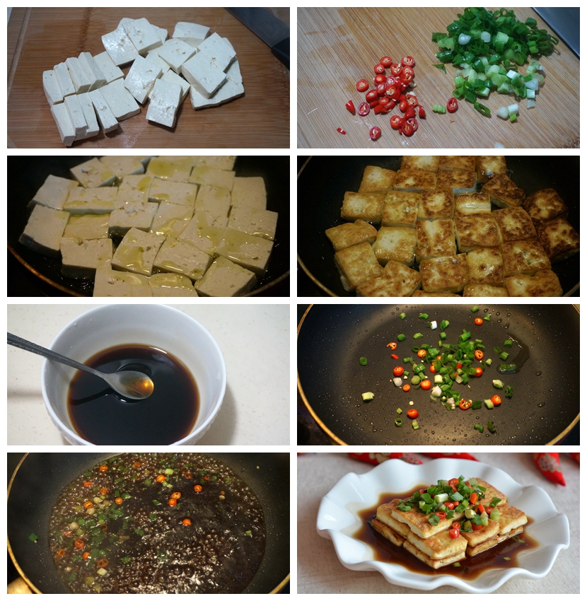 1. 豆腐一块切成长方形大片,厚约一公分;香葱切末,小米椒切圈;