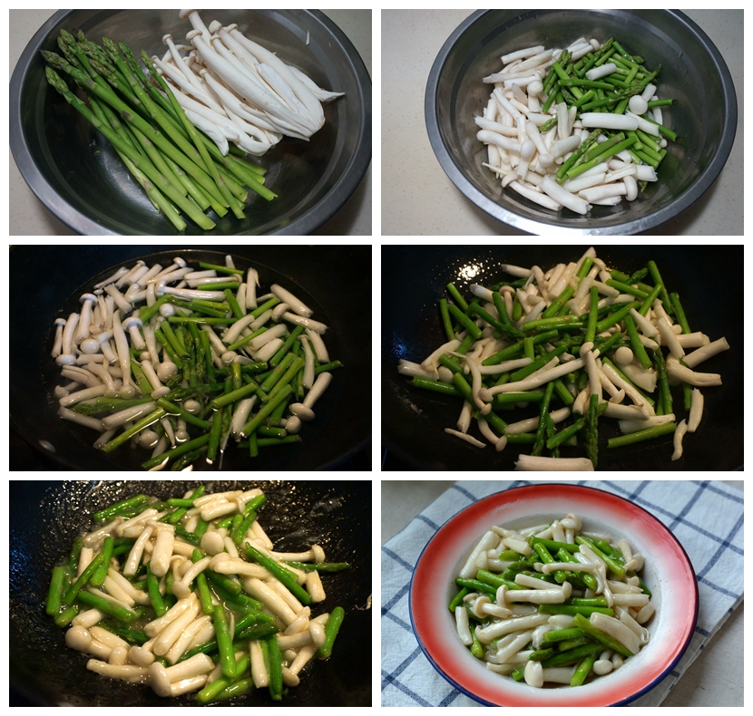 1. 芦笋去老根、老皮,白玉菇冲洗干净;
