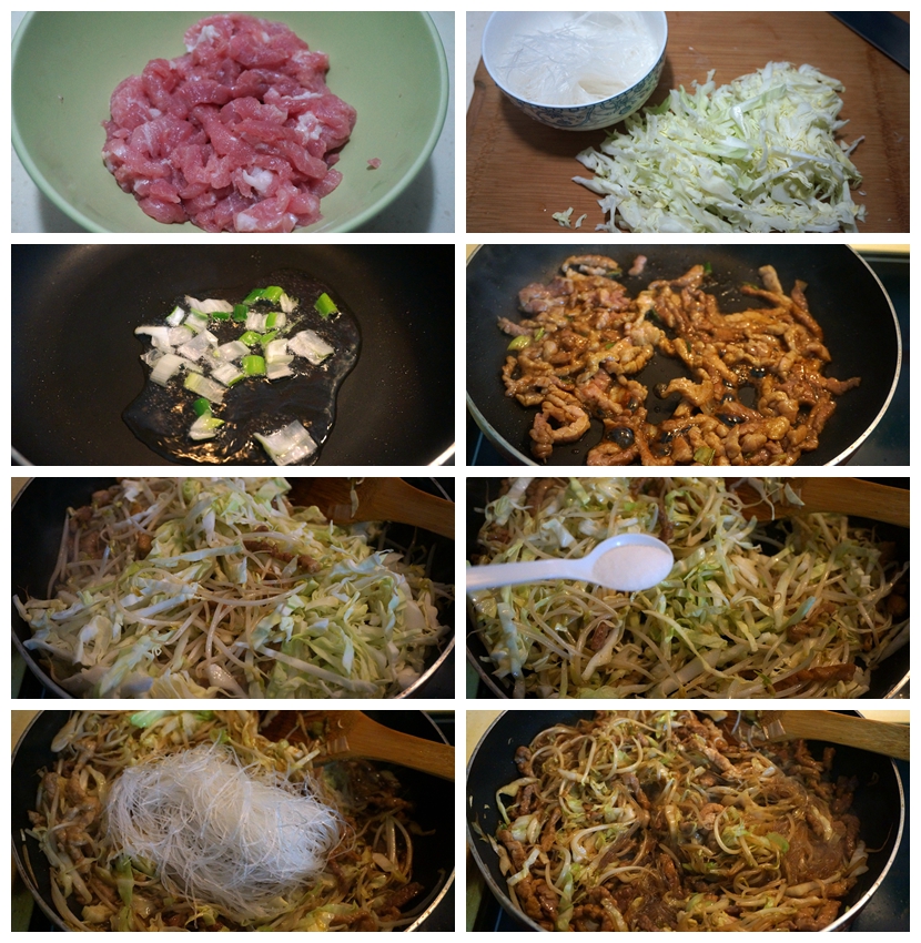2. 圆白菜切细丝,粉丝泡软后剪短;
