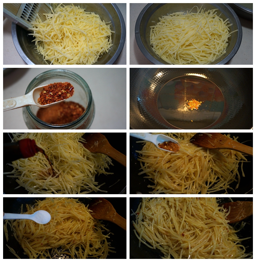 5. 待辣椒粉变成褐色时,快速将土豆丝倒入锅中翻炒,待土豆丝变得有点透明时,倒入米醋,如果不嫌颜色深,倒入陈醋、香醋也是可以的;
