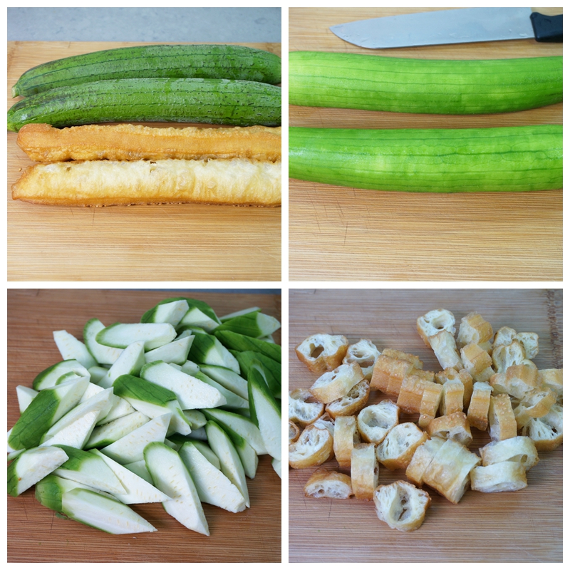 1. 丝瓜和油条准备好,丝瓜是这种无棱的,我个人觉得比那种有棱的更嫩更水灵些;油条其实是一套,我分成两根,2块5一根,好像也不是很便宜,所以下次想吃还是自己炸吧;