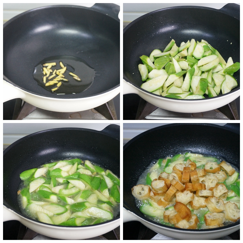 7. 倒少许热水,让丝瓜熟得更透;如果想做油条丝瓜汤,可以多放些水,如果只是想炒一炒,水要少放;