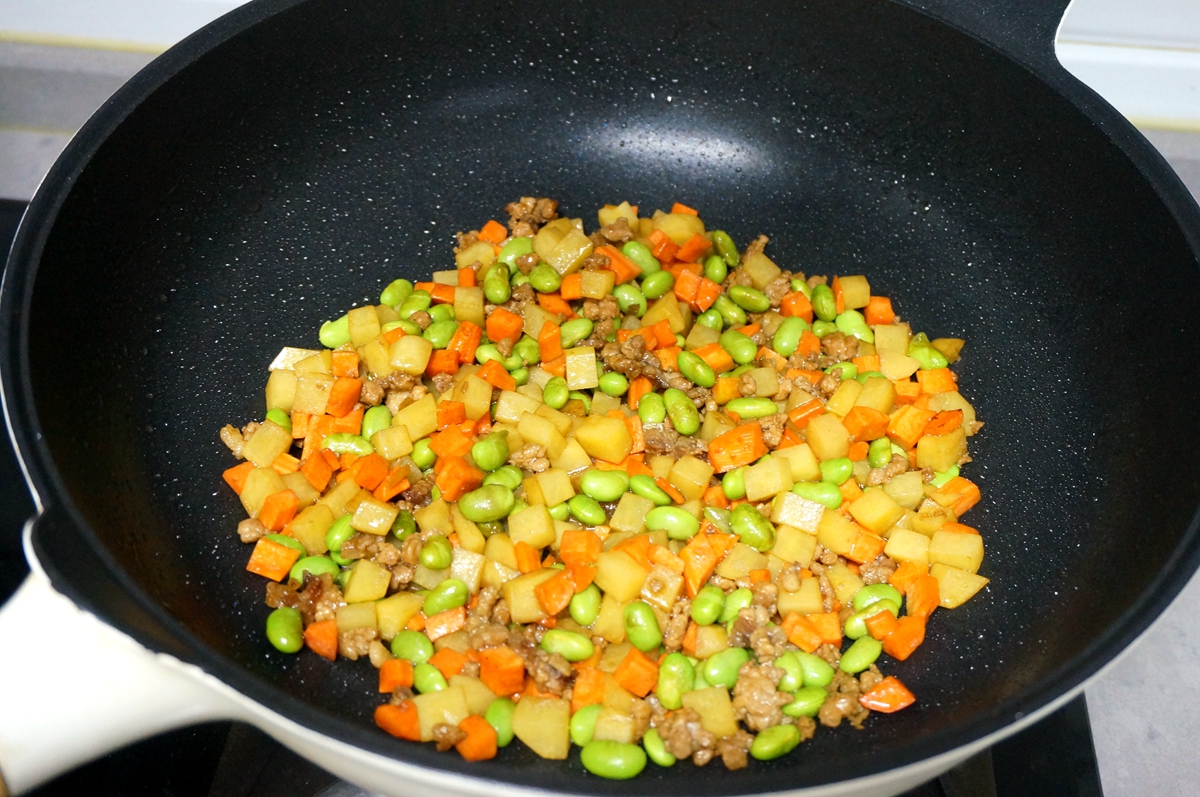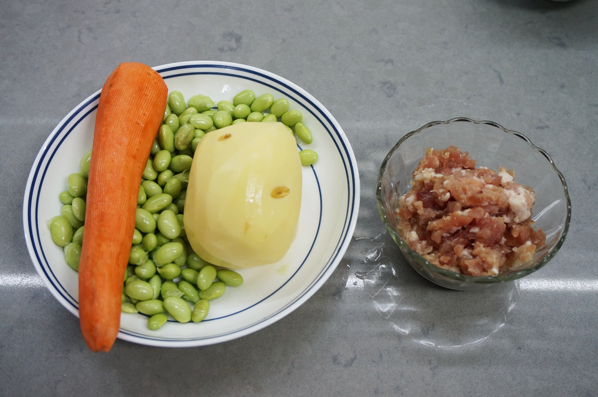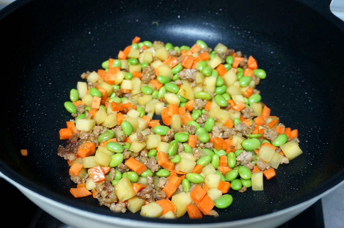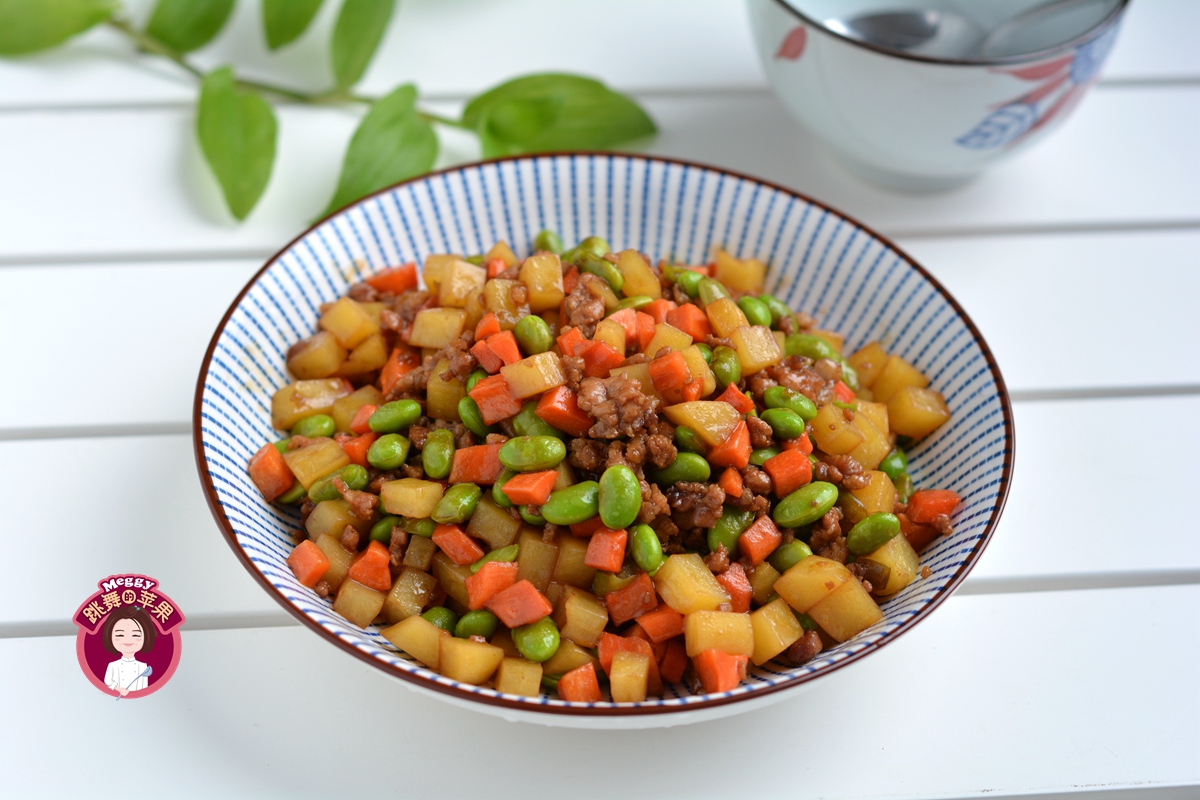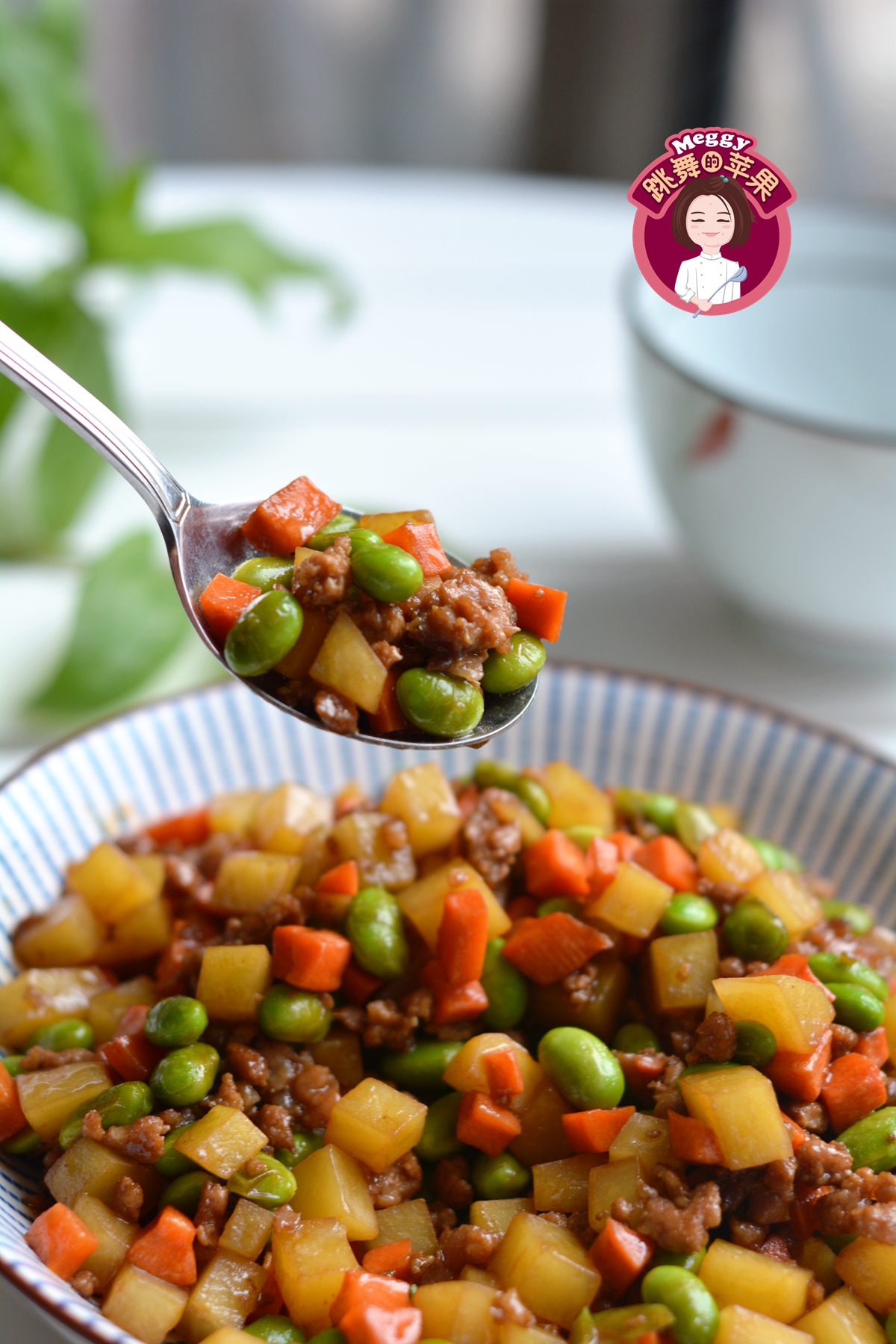 材料:肉馅1小碗,青豆一碟,大土豆1个,胡萝卜1根,油少许,盐少许,酱油少许,蚝油少许,热水少许 (哈哈,统统是少许,因为个人口味不一样,自己来调整呵)