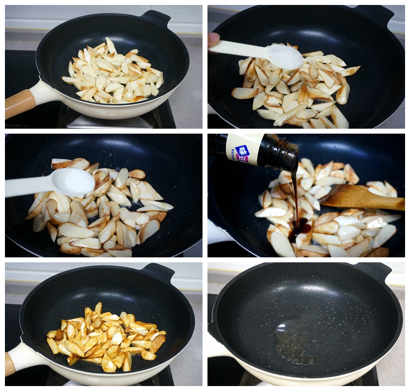 8. 用同一把勺子,舀一勺白糖入锅中,翻炒几下,让糖融化均匀分布在茭白表面;