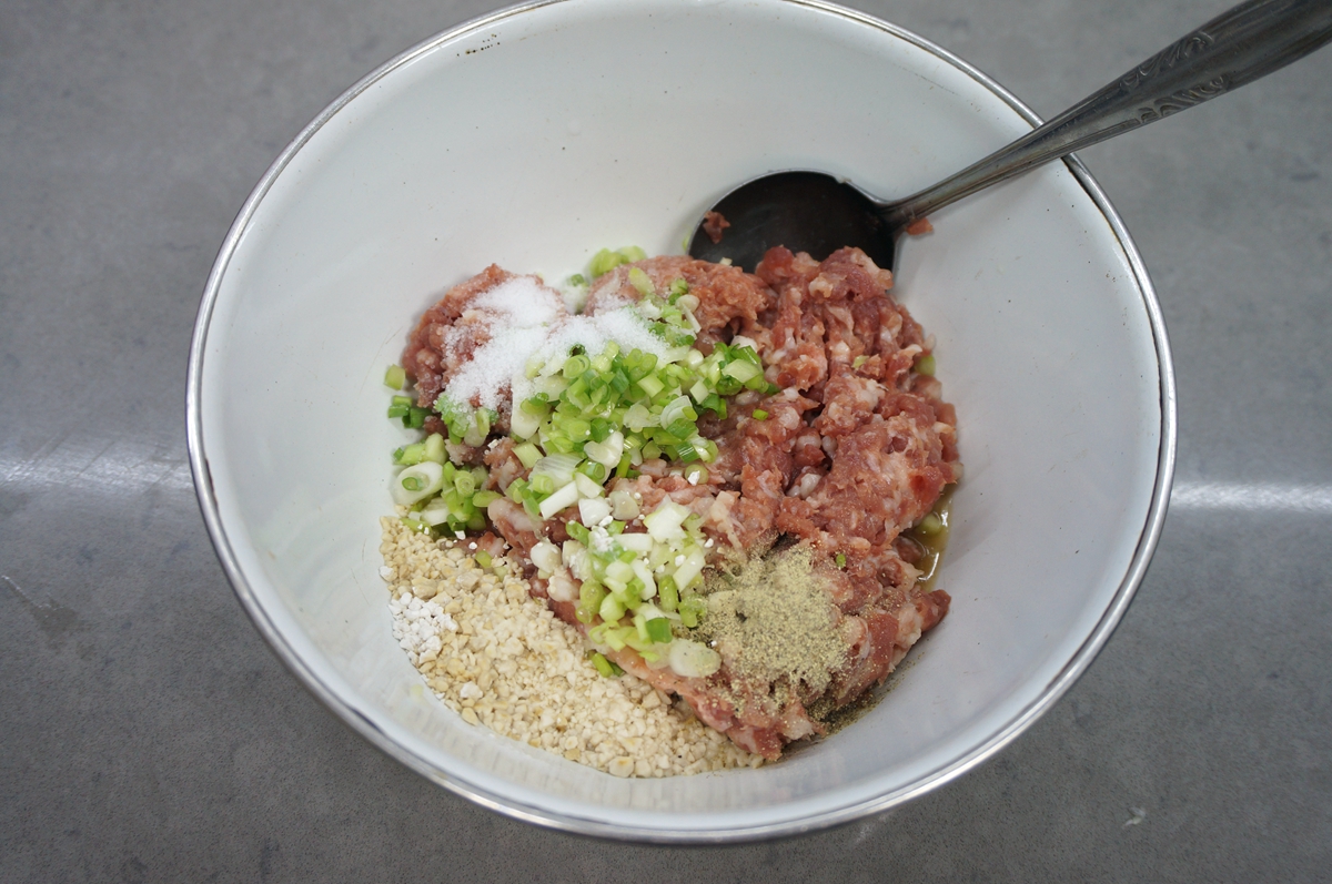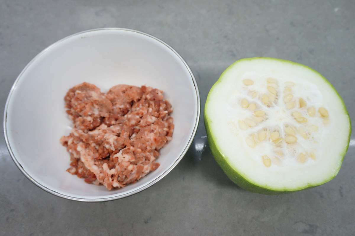材料:小冬瓜半个,羊后腿肉250克,酱油少许,料酒少许,香葱数根,白胡椒粉1勺,盐少许,淀粉2勺,凉水适量,香菜1棵