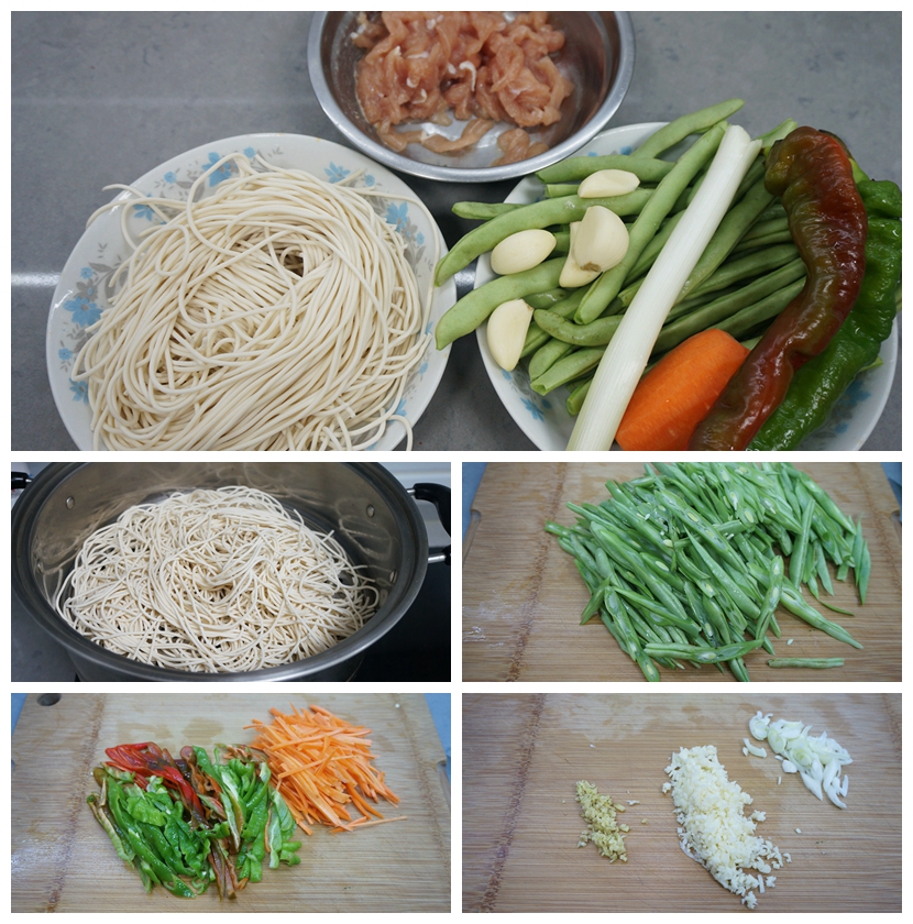 1. 焖面的主材料准备好:面条是用家用面条机压的,粗圆的,也可以做成手擀面或者外买的湿挂面;豆角量可以多一些,辣椒和胡萝卜起到增色和营养的作用,根据喜欢来调整用量;猪肉切丝,用淀粉、料酒、盐抓捏入味儿(实际操作中,我忘记放了),大蒜一定要有,否则失去了独特的风味儿;