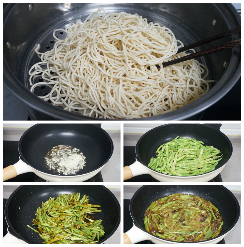 1. 面条先蒸一下,至少半熟了,再入锅中,可以缩短时间,特别适用豆角丝和其它容易熟的菜;如果不蒸,可以将豆角撅段或者用耐煮的菜;