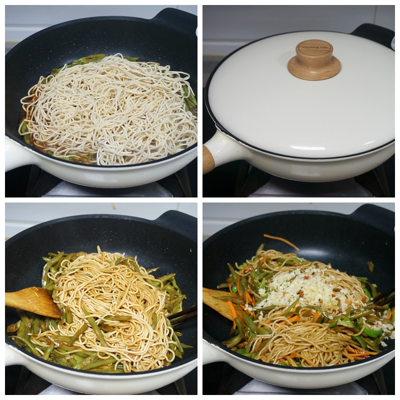 13. 隔着锅盖听到里面有滋滋响,打开锅盖会看到汤汁还有少许,此时快速将豆角丝翻到上面,铲子和筷子相互配合将面条与豆角和汤汁混合均匀,面条处于如饥似渴状态,所以非常地入味;