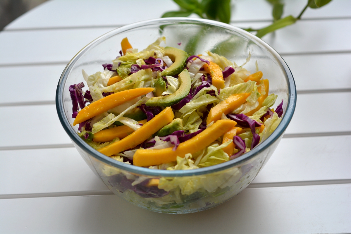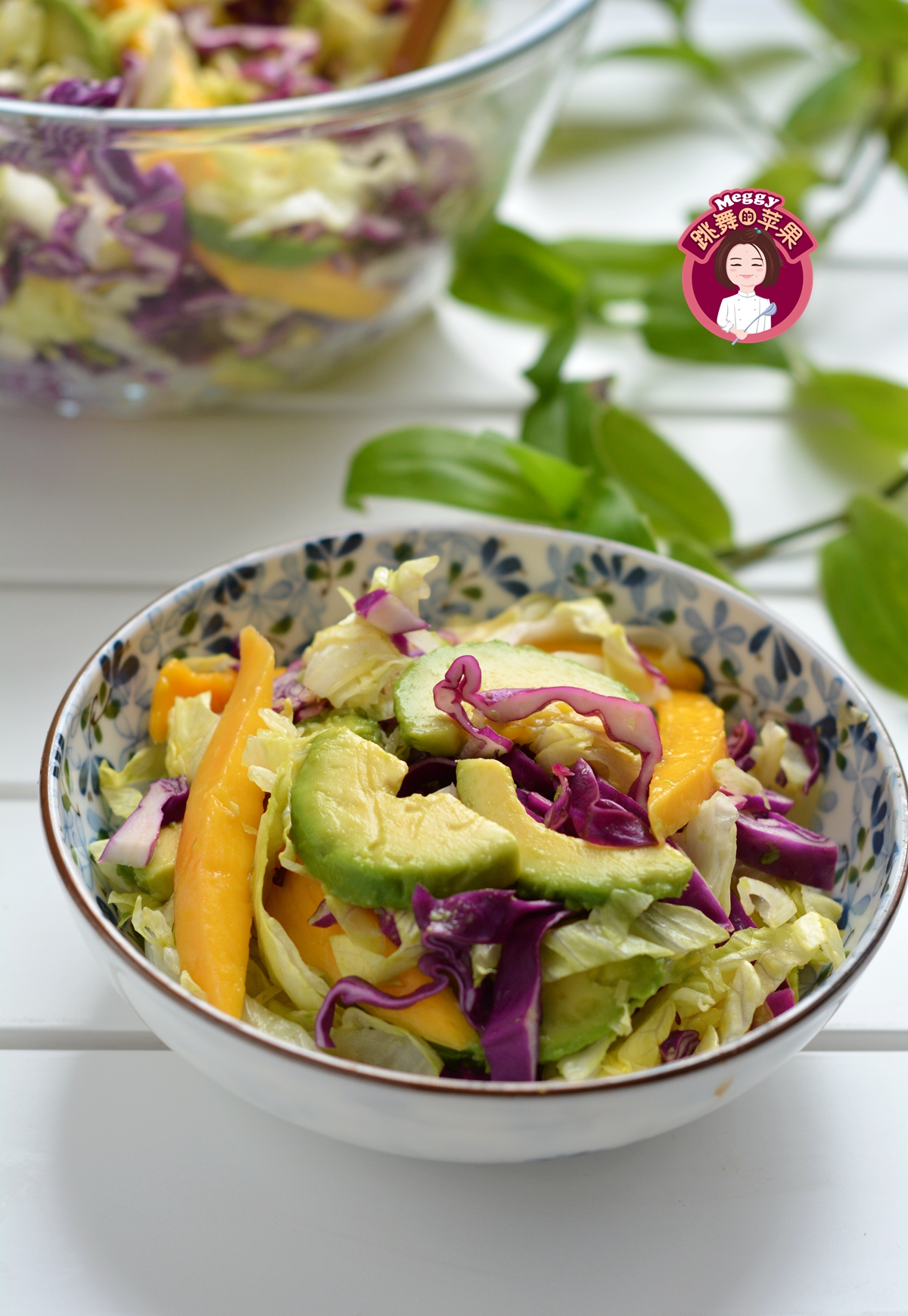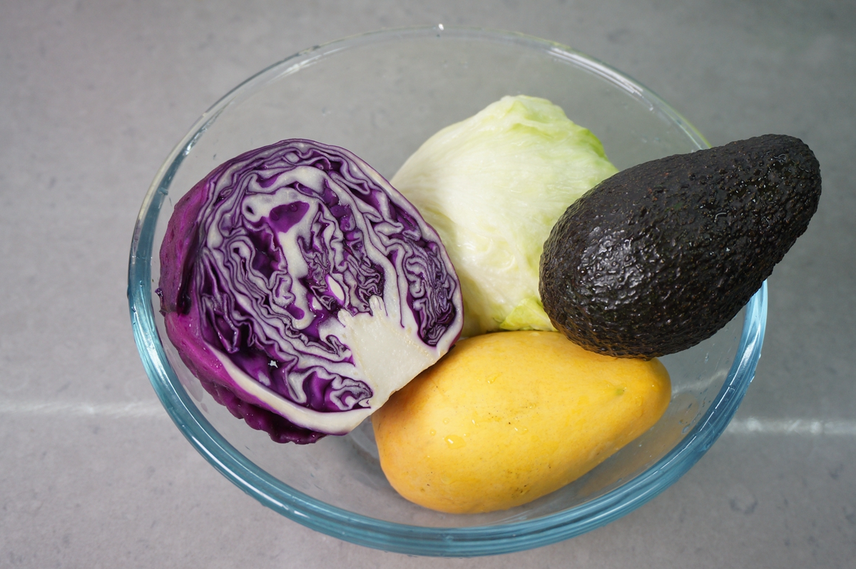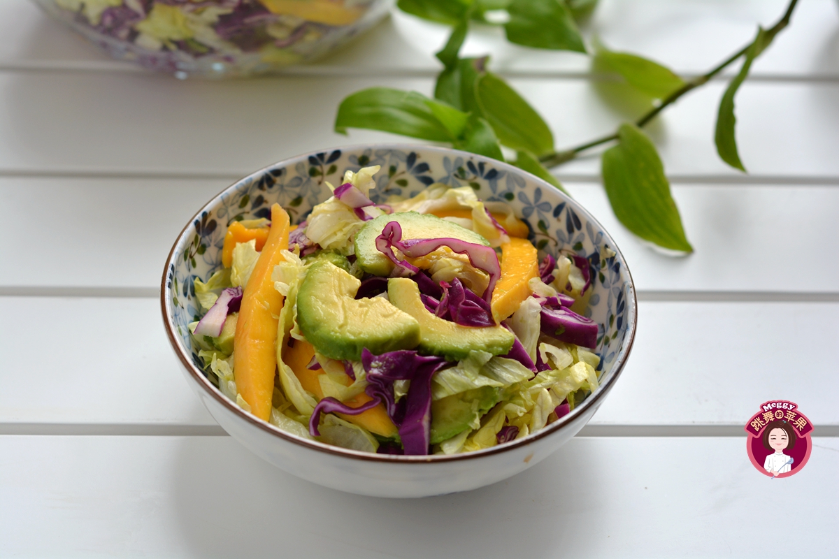 材料:牛油果1个,芒果1个,紫甘蓝1/4颗,球形生菜半个,盐少许,水果醋少许