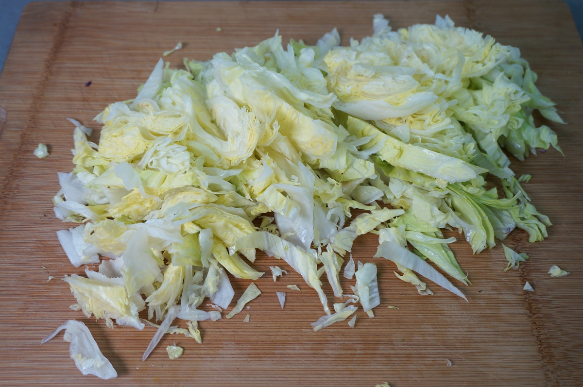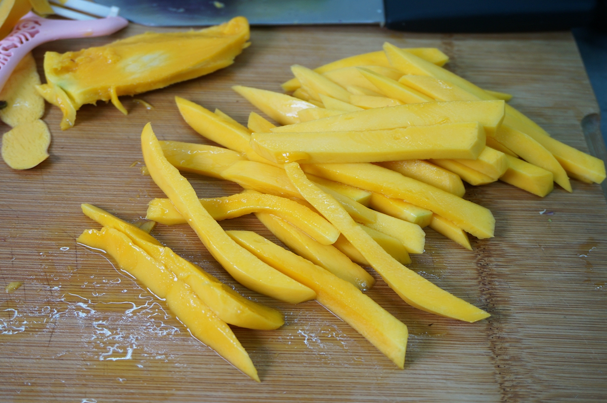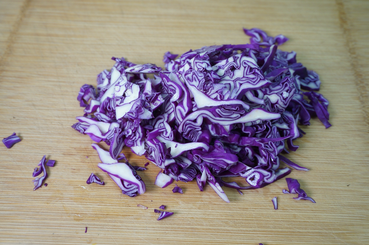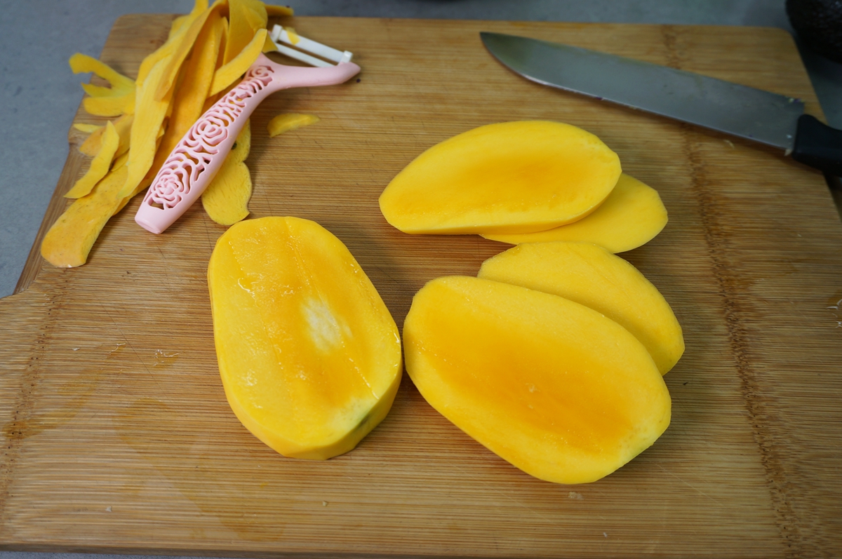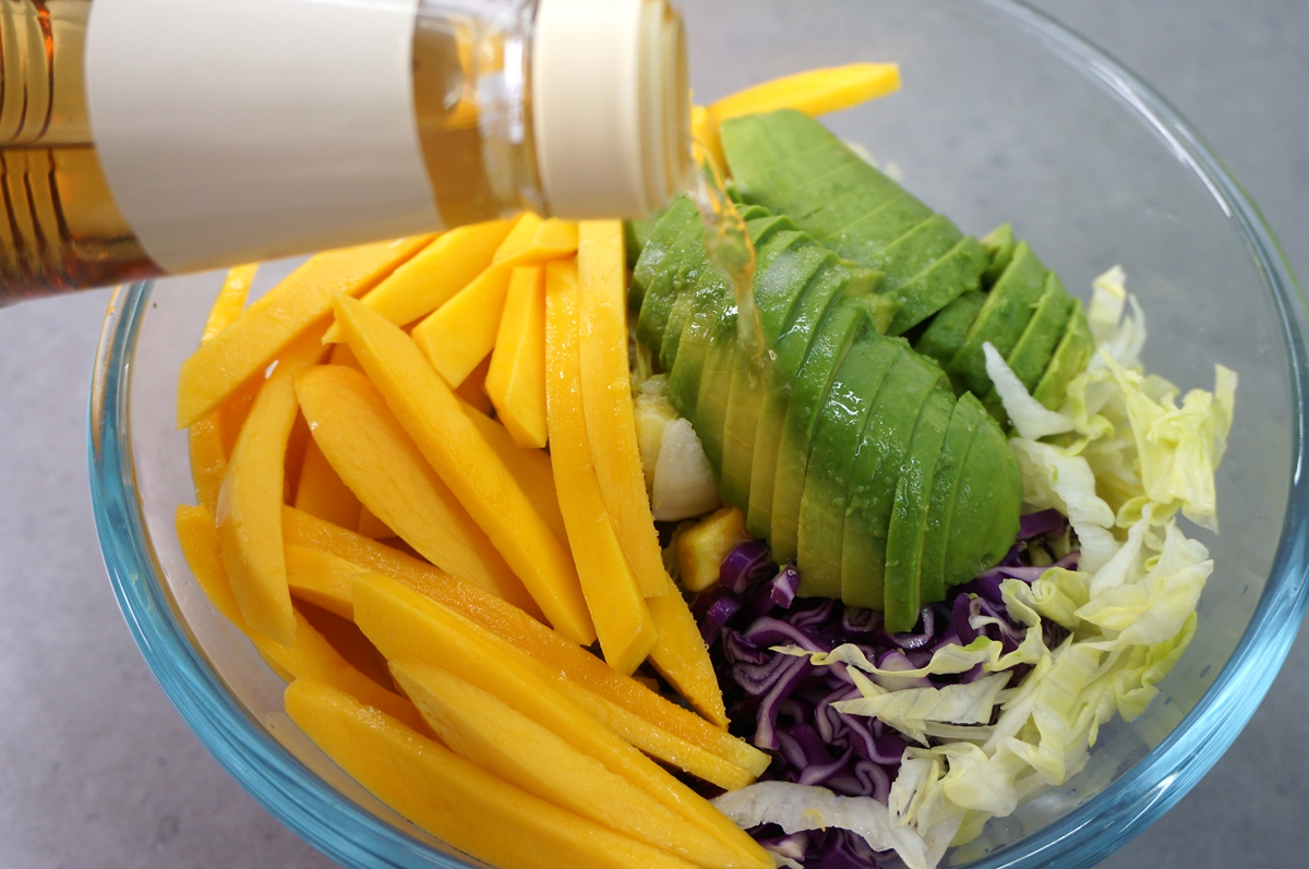 材料:牛油果1个,芒果1个,紫甘蓝1/4颗,球形生菜半个,盐少许,水果醋少许