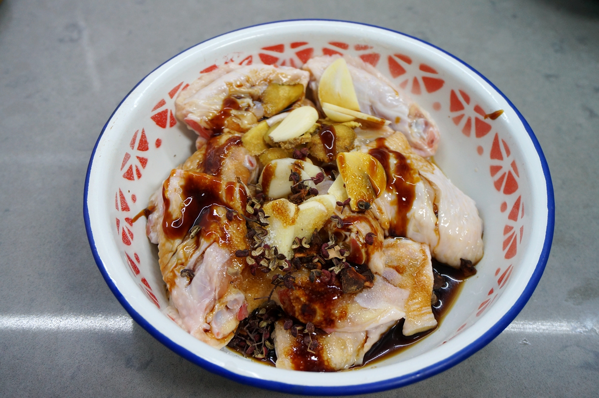 材料:鸡翅中15个,酱油、蚝油、料酒、白糖、盐、姜、大蒜、花椒、八角、蜂蜜