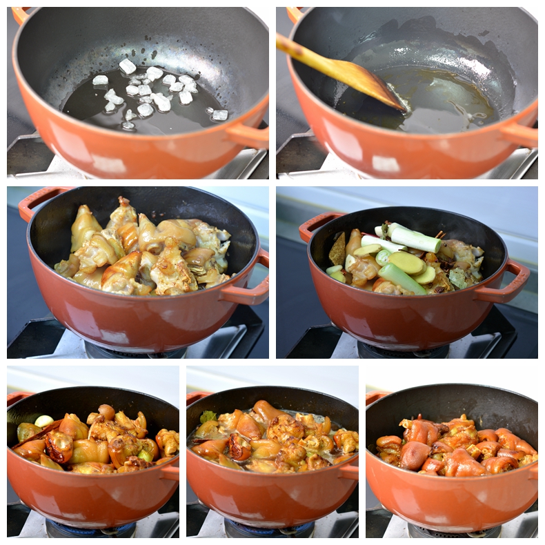6. 将猪蹄倒入锅中,不停地翻炒,火力也由小火调为中火,让每一块猪蹄都均匀带上糖色;