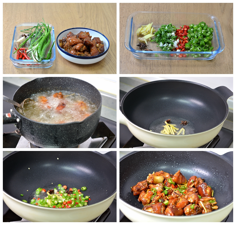 香辣材料:红烧猪蹄1盘,朝天椒1把,青辣椒3根,香葱数棵,姜1块,八角2颗,植物油适量,盐少许
