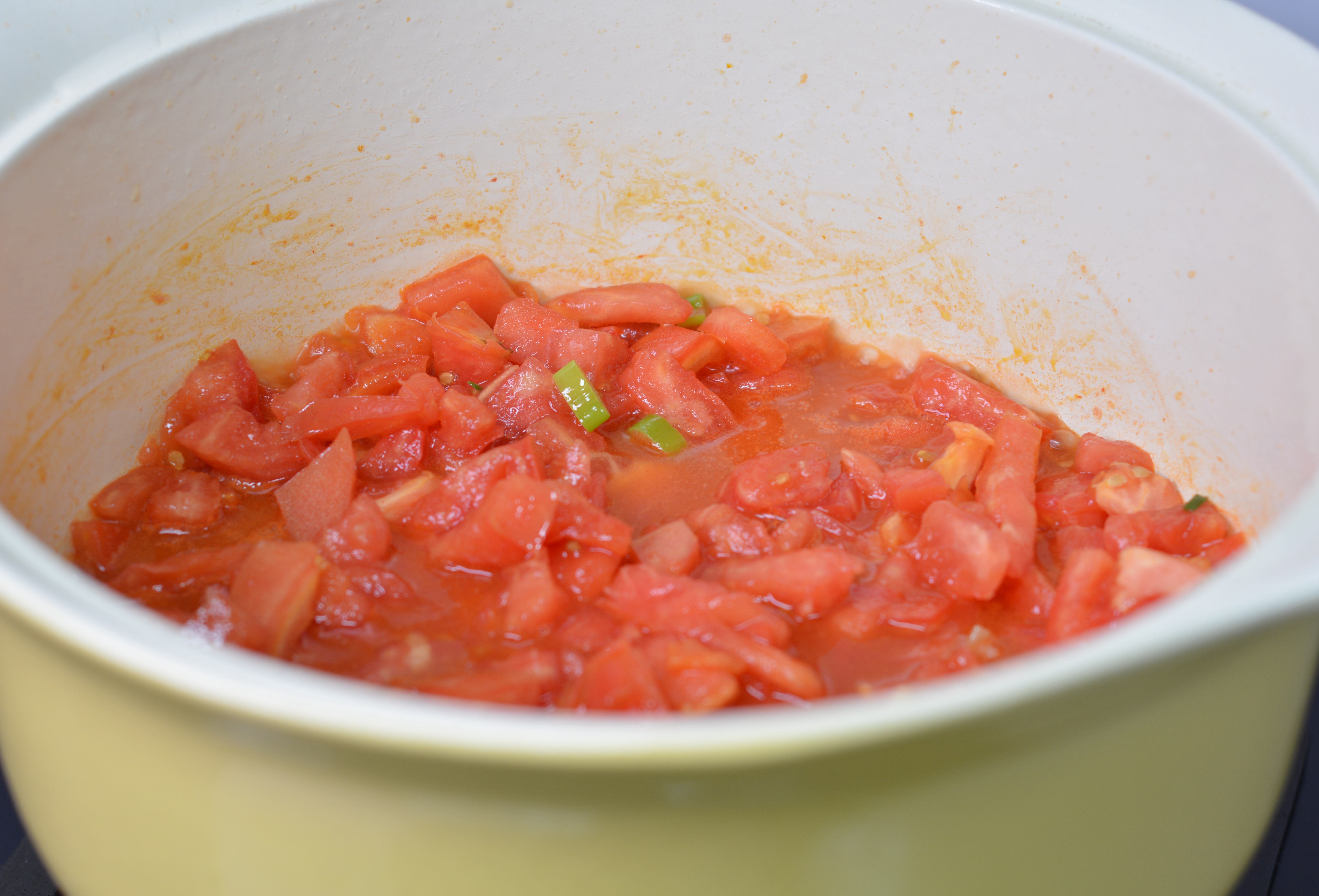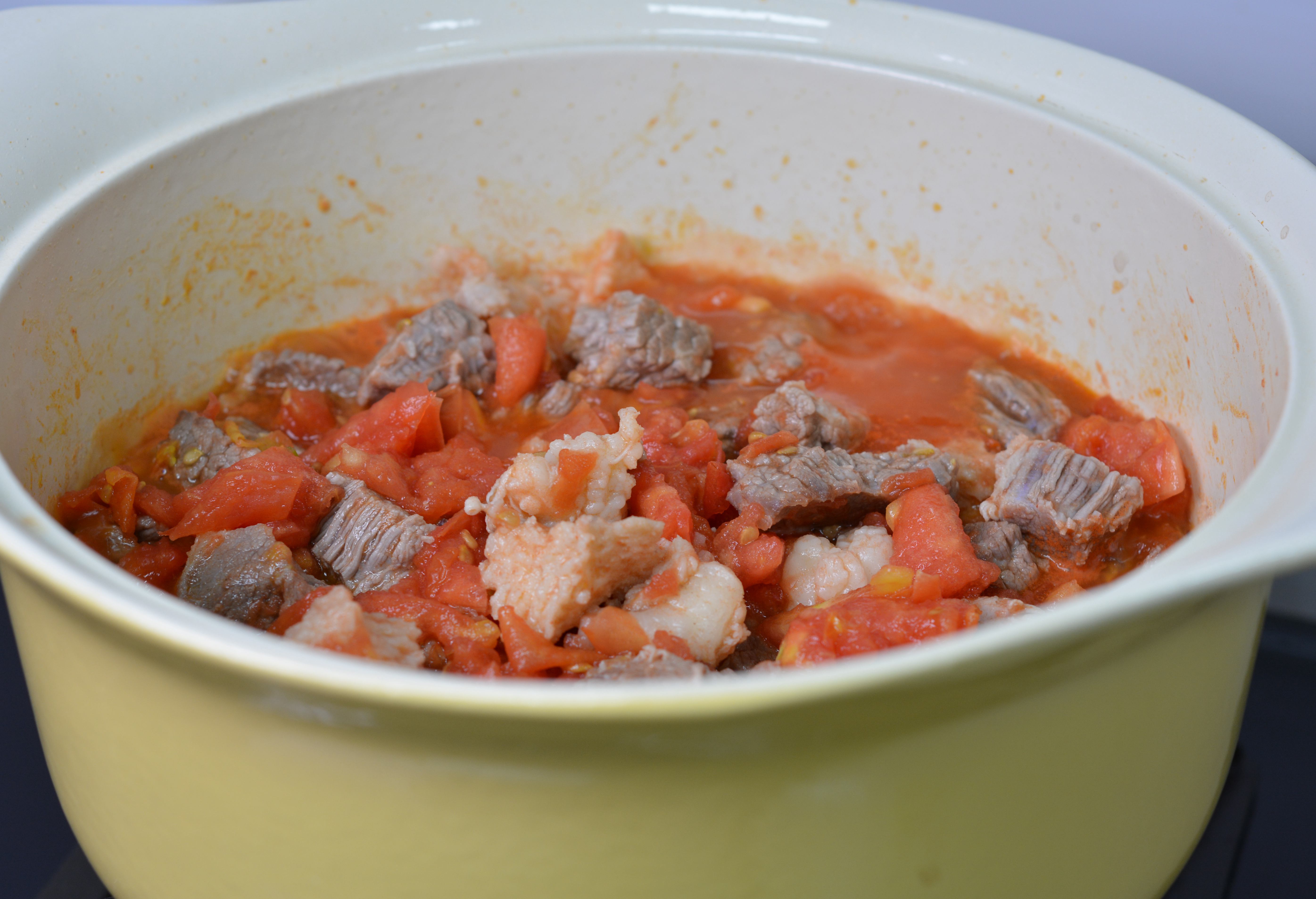 材料:牛腰窝1000克,大番茄2-3个,豆腐皮2张,油少许,葱花少许,生抽少许,盐适量,香葱少许,热水适量