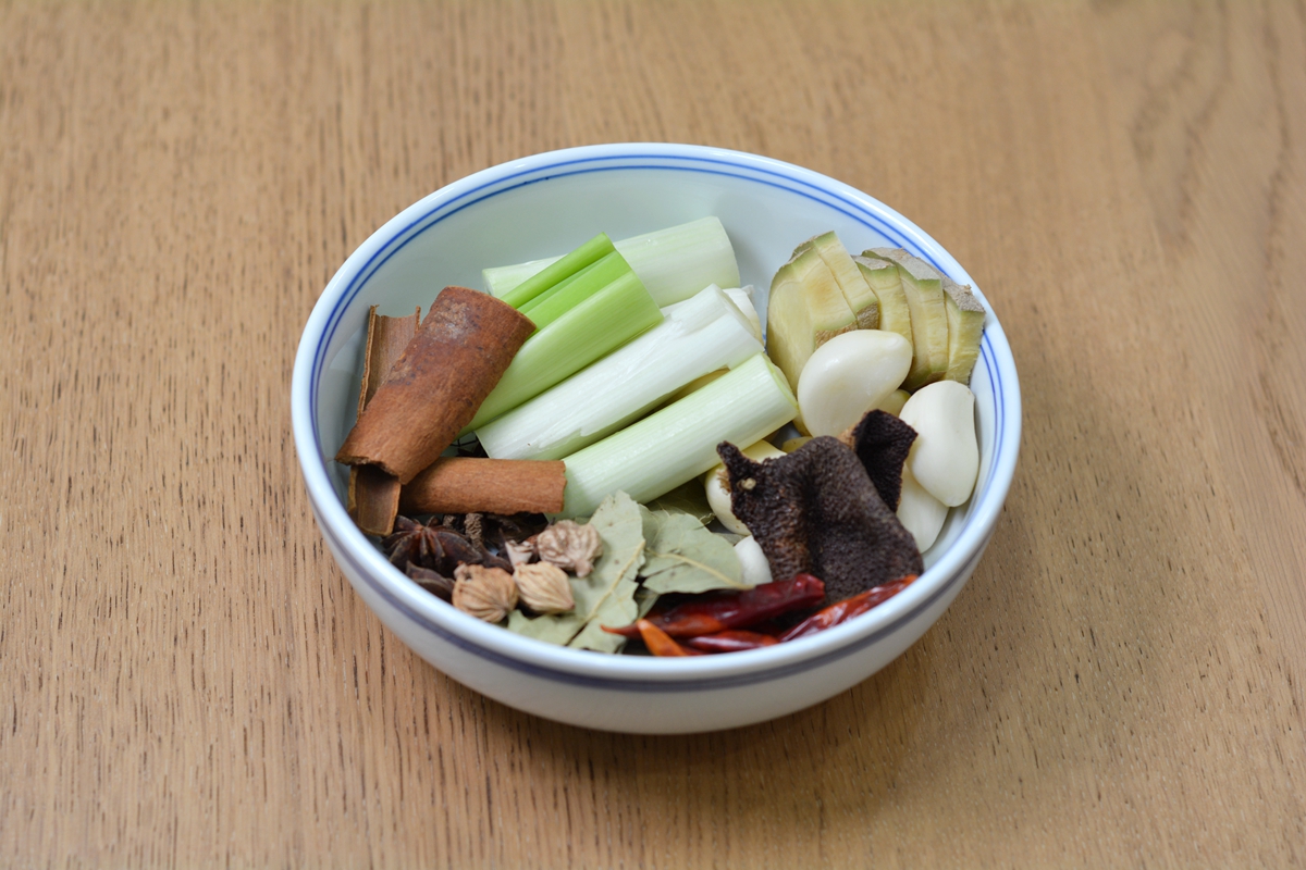 材料:带皮五花肉1500克,大葱1棵,鲜姜1块,大蒜1头,八角4颗,花椒1撮,砂仁4颗,陈皮1块,桂皮1块,干红辣椒3个,酱油适量,生抽少许,盐适量,料酒少许,热水适量