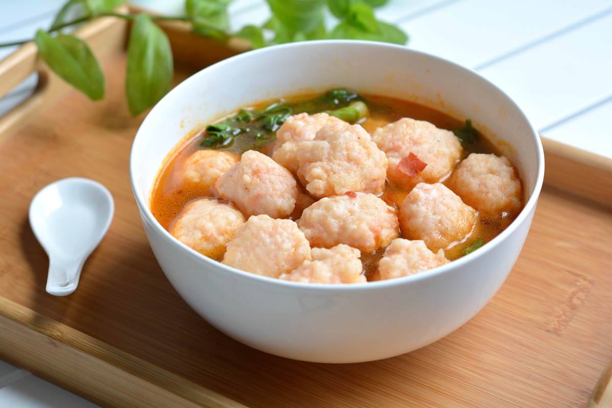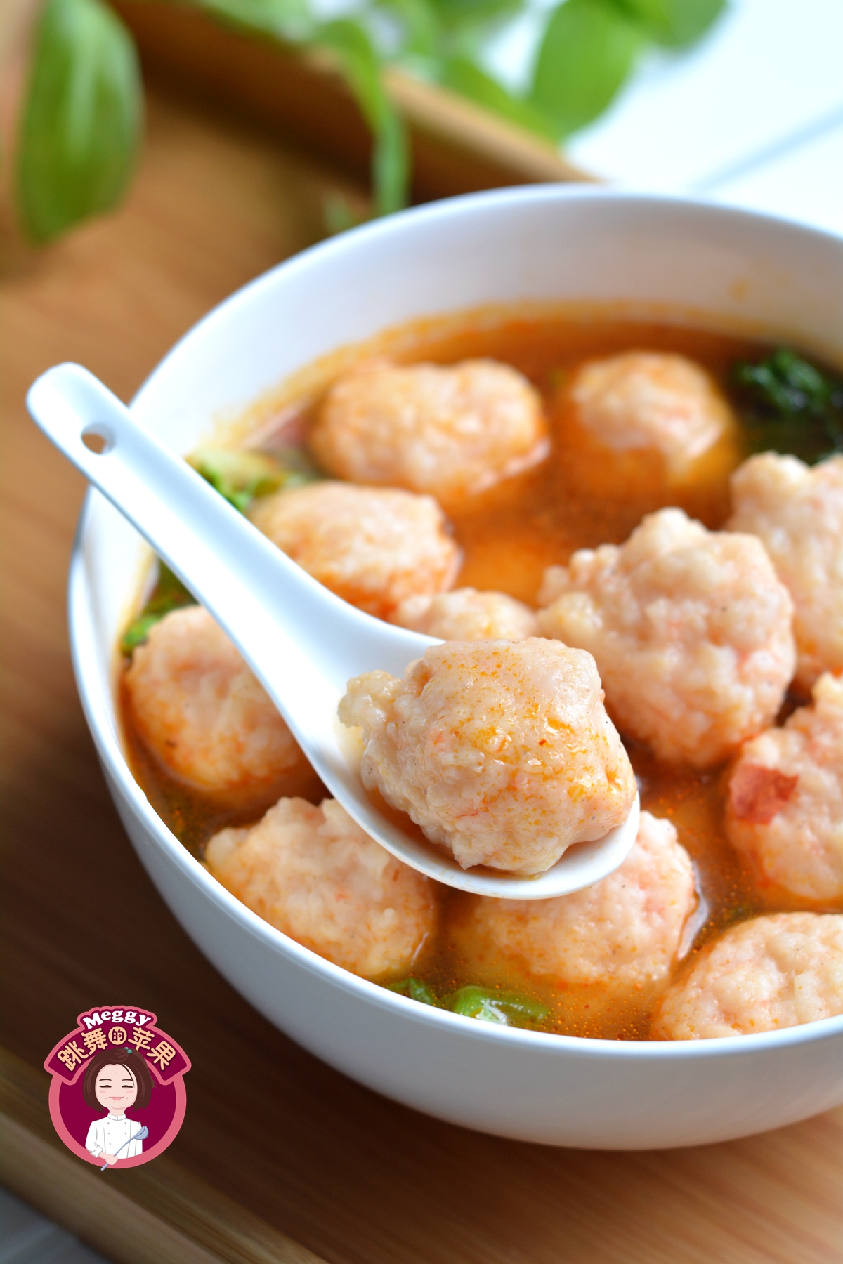 9. 全部虾丸都入汤后,转大火,煮2分钟,加少量盐、生抽调味;将虾丸和汤盛入青菜碗中,开吃喽!