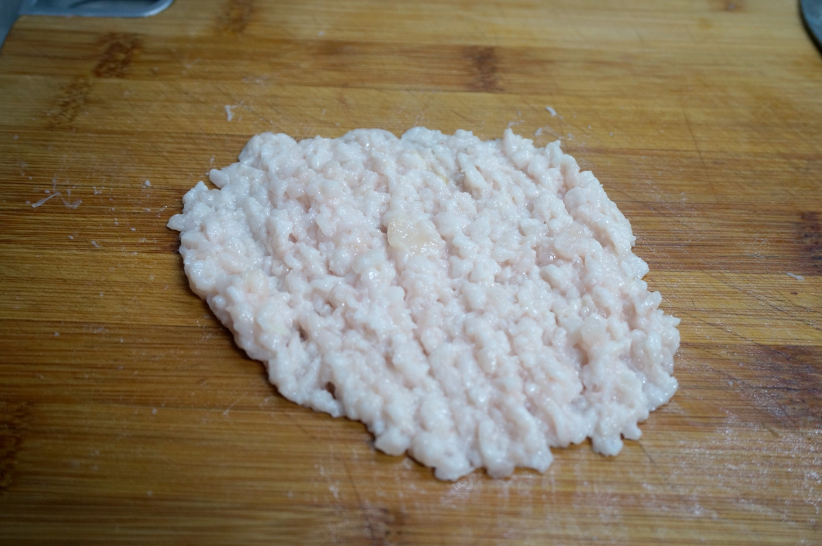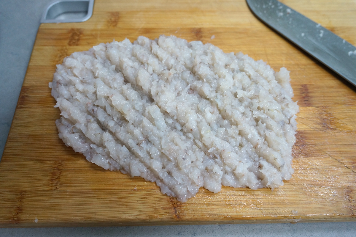 2. 把虾仁去掉上下两根虾线,剁成虾泥;