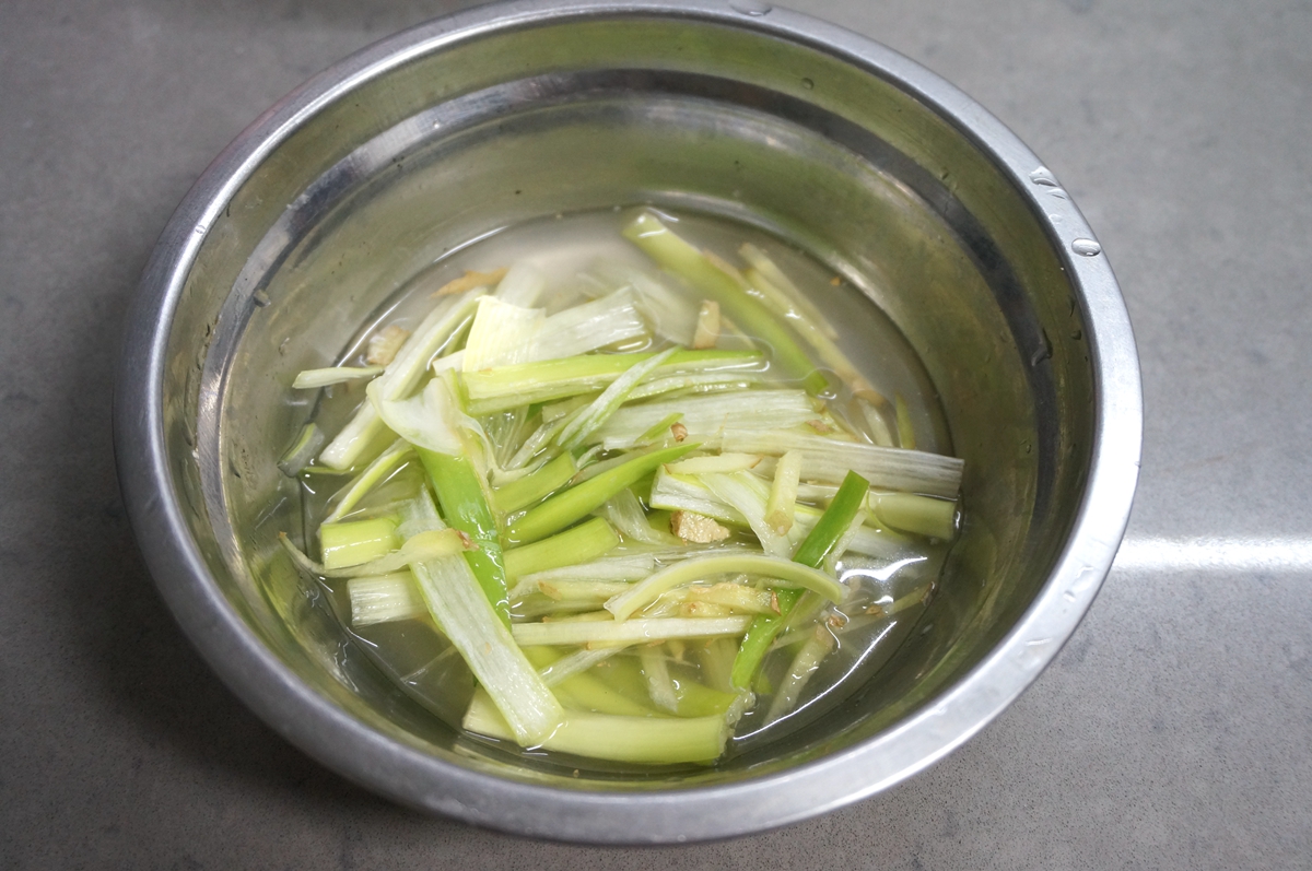 4. 大葱鲜姜切细丝,放少许凉水浸泡,抓捏出汁,此为葱姜水;