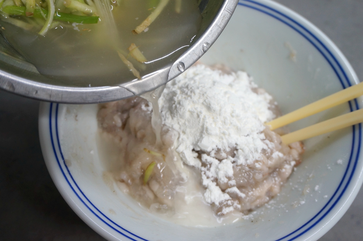 5. 将虾泥、肥肉泥、少许白胡椒粉、少许盐、1个鸡蛋清,两小勺淀粉,适量的葱姜水倒入,顺着一个方向搅拌上劲,能用筷子挑起来,但又很快滴落下来;