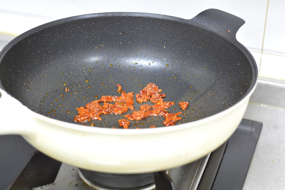 6. 炒锅中倒少许油,将1勺豆瓣辣酱入锅中,小火煸炒出香味和红油;