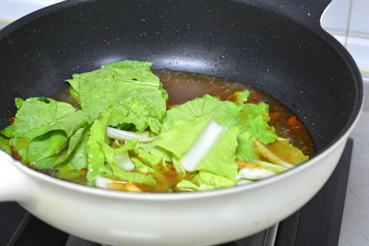 7. 倒入适量清水,烧开,青菜切成寸段投入汤中,变色即捞入大碗中;转微火,保持汤微沸状态即可;