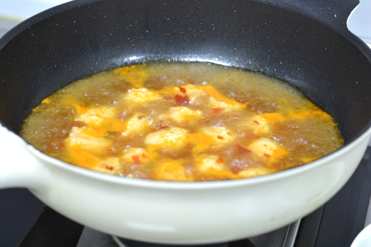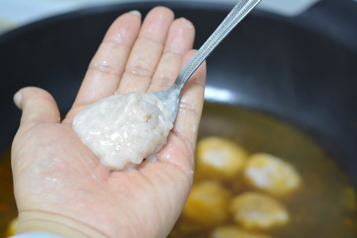 8. 左手沾水,右手舀一勺虾糊,在手上团几下,使其表面光滑成球状,用勺子将虾丸送入汤中;