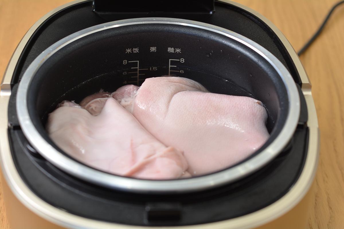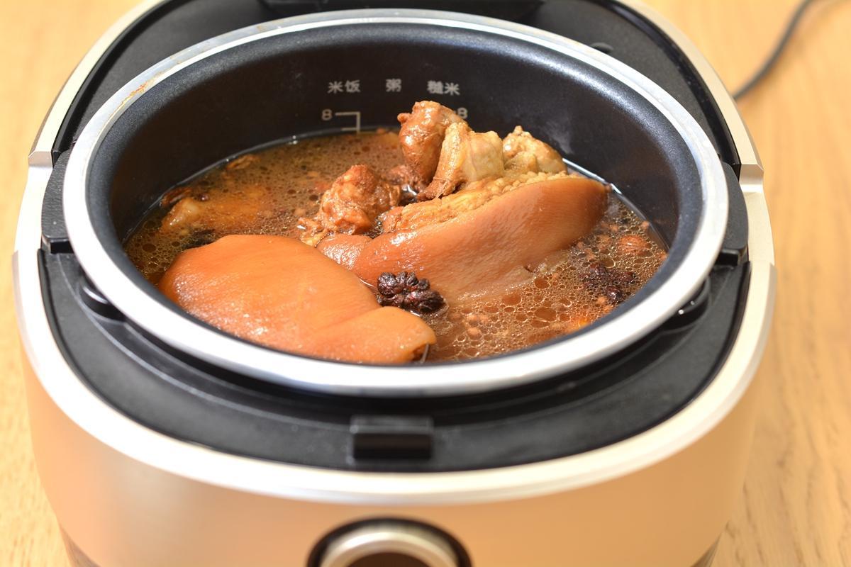4. 肘子入电饭煲内胆中,选择“煲汤”程序,水量以电饭煲的最大水位线为准;