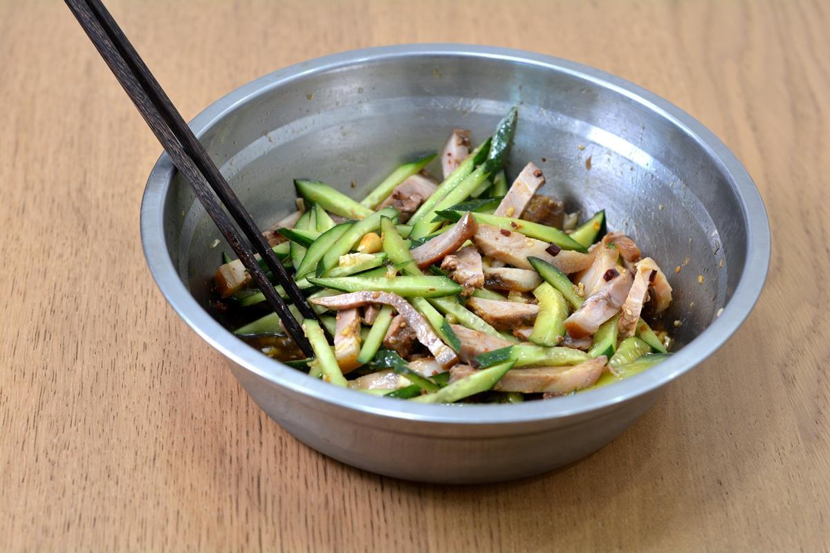 9. 肘子切粗条,淋辣椒油、醋、与粗黄瓜丝同拌,是一道开胃不腻的下酒下饭小菜;尤其卷烙饼非常棒!