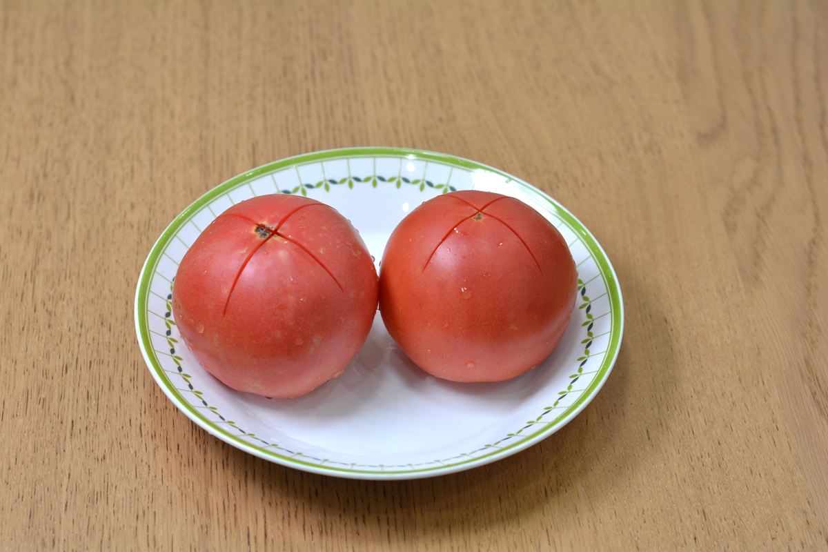 2. 在西红柿顶端切十字花刀,要划破皮,刀口长2公分即可,扔到开水锅中煮15秒左右,让西红柿在开水中滚一遍;