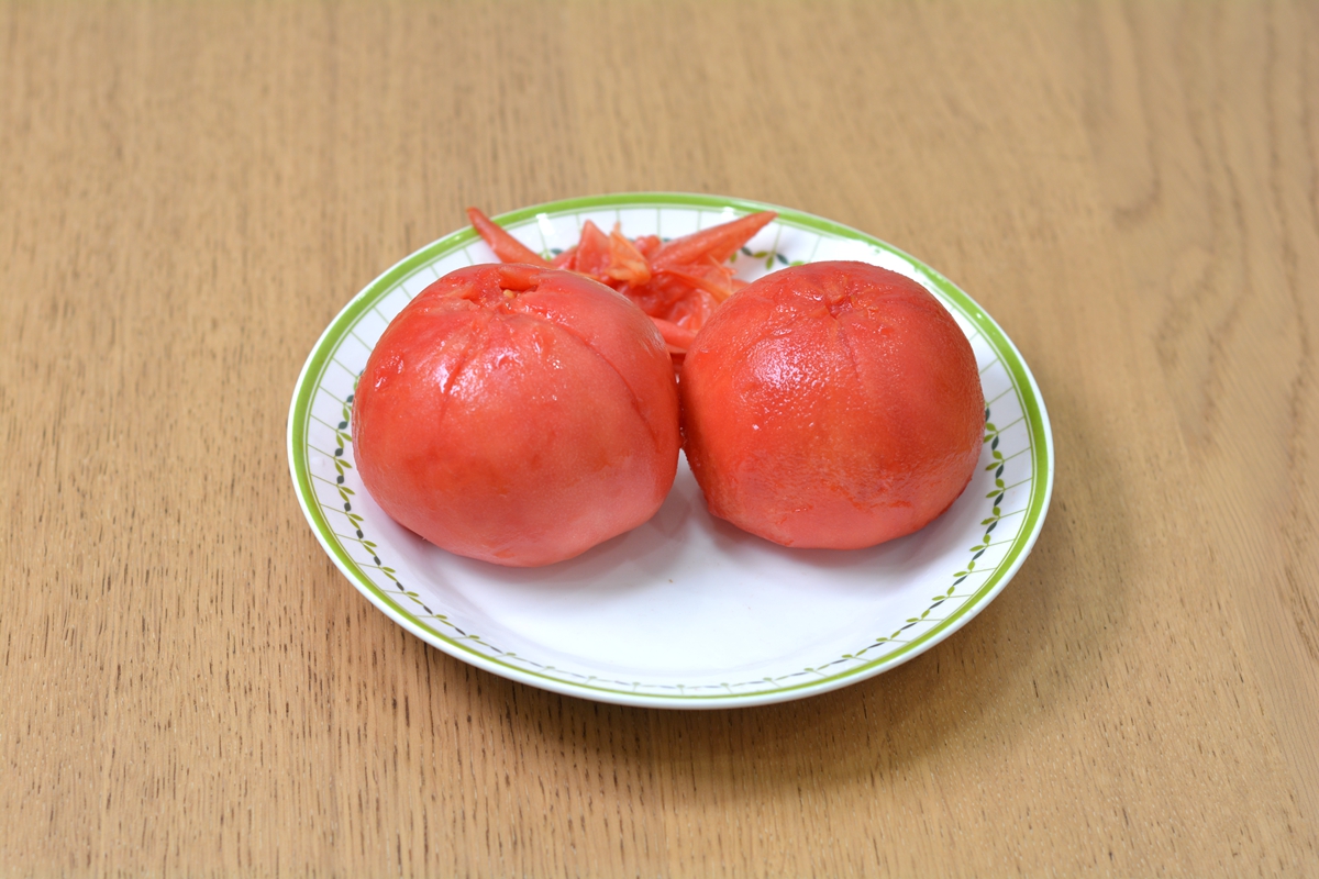 3. 将西红柿捞出,用手指轻轻掀开十字花刀处的皮儿,往四外一扯,整张西红柿皮就掉下来了;